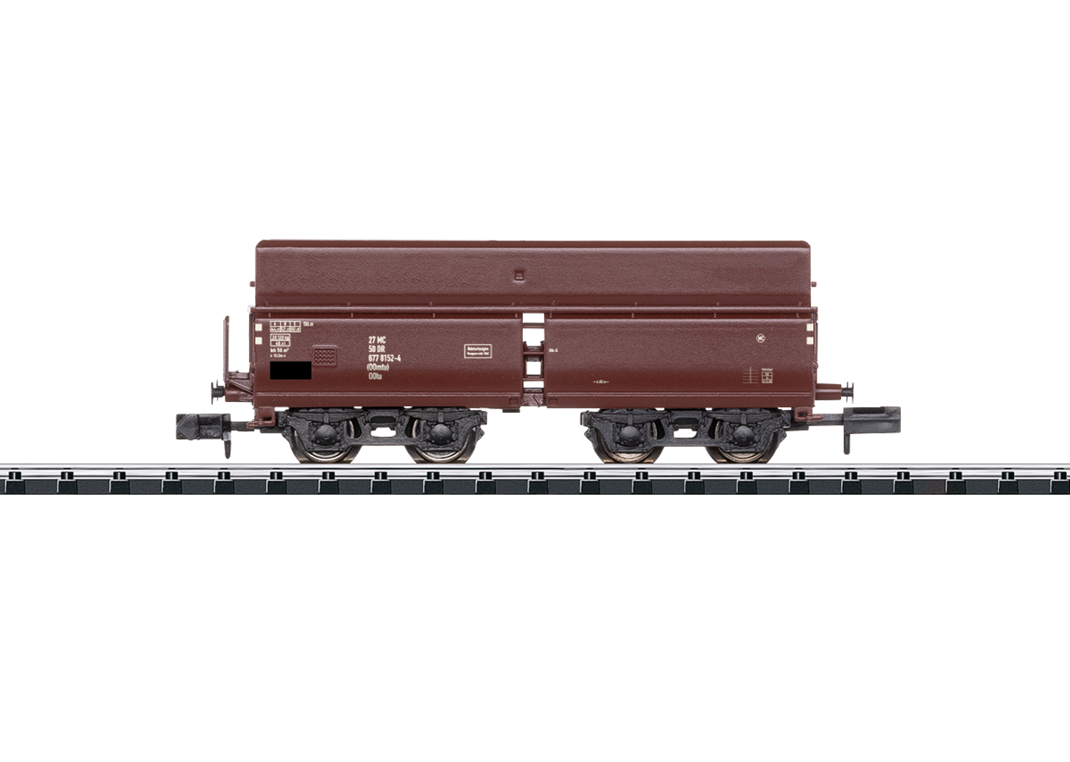 Selbstentladewagen - Vorbild: Selbstentladewagen OOtu 6778 der Deutschen Reichsbahn (DR) im Zustand Anfang der Epoche IV. Ausführung mit mittlerem Oberkasten, zwei Entladeklappen je Längsseite und stirnseitiger Bremserbühne. Eingesetzt zum Transport von Koks. Geschweißte Pressblech-Drehgestelle der Einheitsbauart, mit eingeschweißtem Unterzug als Verstärkung. Betriebszustand um 1969.Modell: Selbstentladewagen in detaillierter Ausführung mit Bremserbühne und stirnseitigem Stellrad, mit Ladegut-Einsatz Koks in maßstäblicher Körnung und mit Kinematik für Kurzkupplung. Länge über Puffer 64 mm.