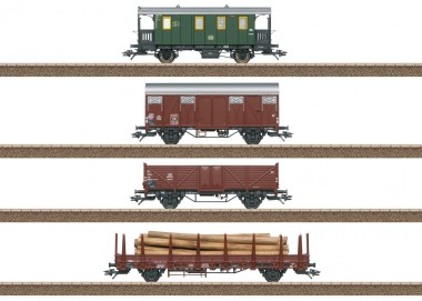 Güterwagen-Set Nebenbahn - Vorbild: Vier Güterwagen unterschiedlicher Bauarten der Deutschen Bundesbahn (DB). Ein Lokalbahn-Gepäckwagen Bauart LPwPost, ein gedeckter Güterwagen Bauart Gmhs 53, ein offener Güterwagen Bauart Omm 37 und ein Rungenwagen Bauart Rlmms 56. Betriebszustand Ende der 1950er-Jahre.Modell: Lokalbahn-Gepäckwagen mit vielen angesetzten Details. Gedeckter Güterwagen mit Tonnendach und plattenbekleideten Seitenwänden. Offener Güterwagen mit hölzernen Bordwänden und doppelflügeligen Seitenwandtüren. Mit Ladeguteinsatz zur Darstellung von Schrott. Rungenwagen mit separat angesetztem Sprengwerk. Mit Holzstämmen beladen. Separat ansteckbare Rungen liegen bei. Alle Wagen einzeln verpackt in zusätzlicher Umverpackung. Gesamtlänge über Puffer ca. 50,5 cm. Wechselstromradsatz E36667900 (Gepäckwagen), E700150.Eine passende Dampflokomotive finden Sie im Trix H0-Sortiment unter der Artikelnummer 25086.