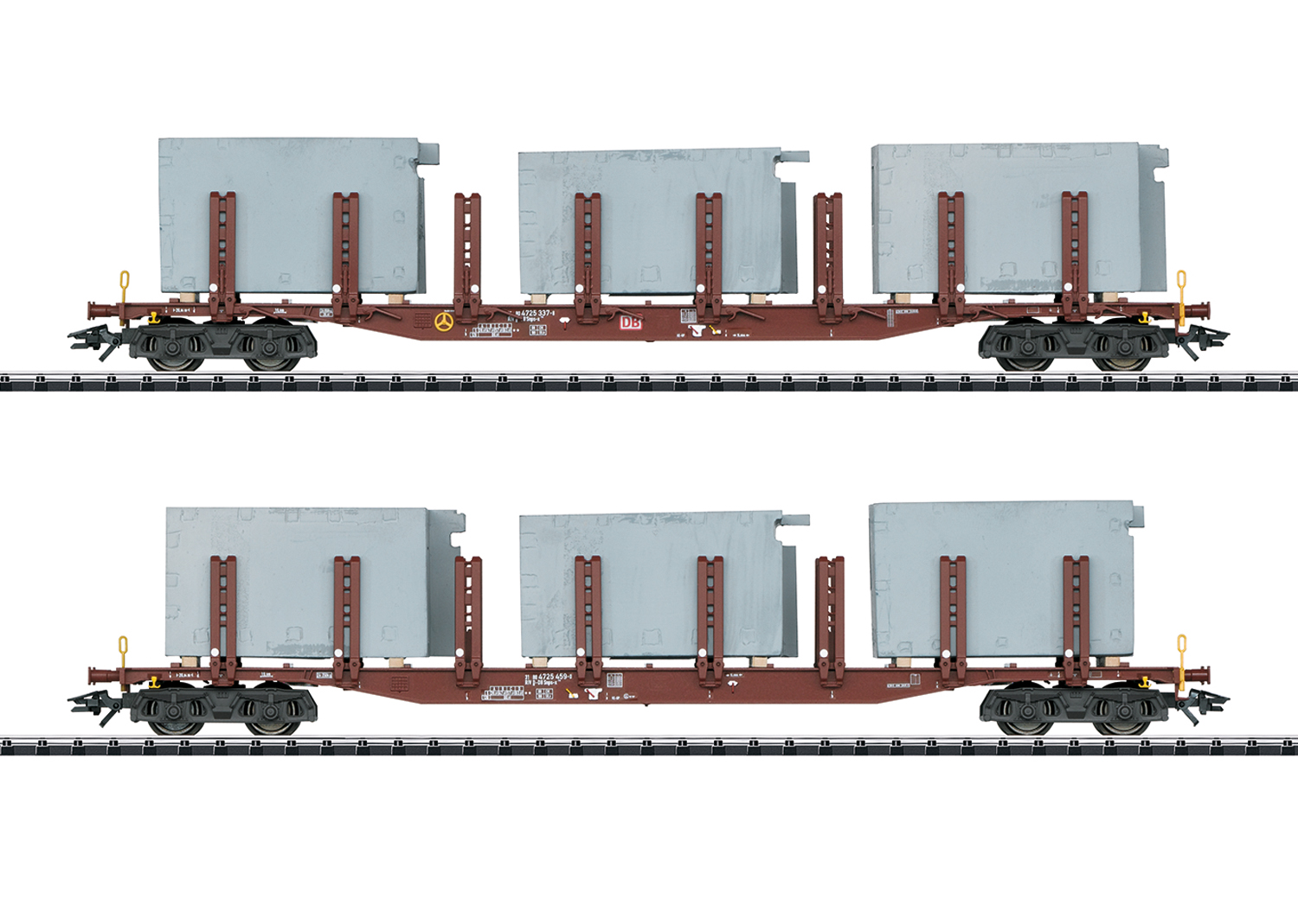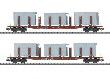 Modell: Detaillierte fest stehende Rungen. Verschiedene Betriebsnummern. Jeder Wagen beladen mit drei "Badsystemen". Beide Wagen sind einzeln verpackt und in einer Umverpackung. Gesamtlänge über Puffer 48,0 cm.