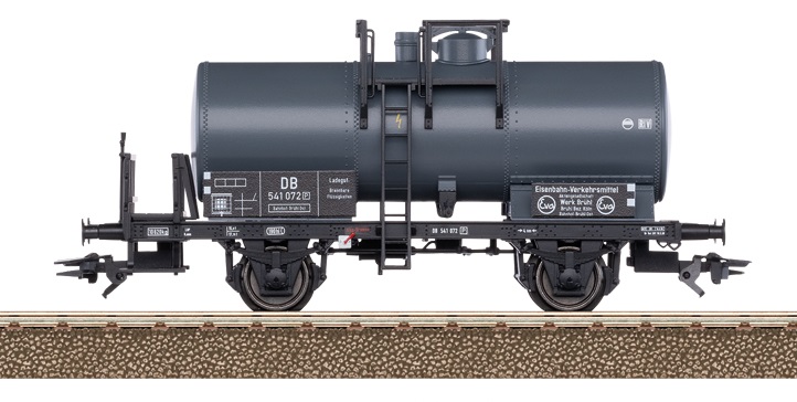 Kesselwagen ohne Bremserhaus, EVA - Vorbild: 2-achsiger Kesselwagen mit genietetem Kessel mit 19,2 m3 Fassungsvermögen. Betriebszustand 1950 bis 1959.Modell: Kesselwagen EVA mit zwei Achsen in detaillierter Ausführung mit Betriebsnummer 541 072. Detailliertes Fahrgestell mit durchbrochenem Rahmen. Detailliert nachgebildete und separat angesetzte Handbremskurbel, Bremsanlage und Entleerungsrohre. Angesetzte Arbeitsbühne mit Aufstieg. Angesetzte Bremserbühne. Mit kulissengeführten Kurzkupplungen. Dieser Wagen ist einzeln verpackt im Display 24170 enthalten. Länge über Puffer ca. 10,1 cm. Wechselstromradsatz E700150 separat erhältlich.Weitere Kesselwagen mit weiteren Betriebsnummern finden Sie im Display im Märklin H0-Sortiment unter der Artikelnummer 00719 mit Angabe der benötigten Gleichstromradsätze.