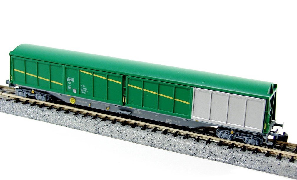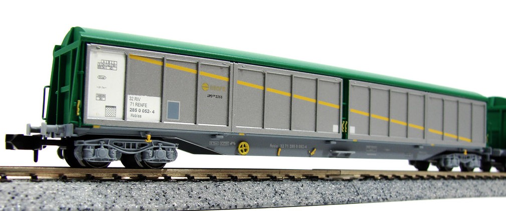 Zweiteiliges Schiebewandwagen-Set der Bauart Habiss der RENFE für die Epoche 4/5. Ein Wagen in grüner Farbgebung und ein Wagen mit silbernen Seitenwänden.