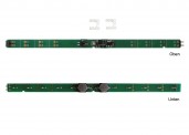 LED-Innenbeleuchtung warmweiß Universal-Platine mit mehreren Leuchtdioden zur Nachrüstung der meisten Personenwagen im Märklin H0-Sortiment. Eingebauter Pufferspeicher ermöglicht einen flackerfreien Betrieb. Helligkeit der Innenbeleuchtung manuell einstellbar. Für kürzere Wagen kann die Platine an mehreren Stellen gekürzt werden. Haltebügel zur Befestigung auf der Inneneinrichtung liegen bei. Zum elektrischen Anschluss ist je nach Wagentyp eine separate Stromzuführung 73404, 73405 bzw. 73406 oder die stromführende Kupplung 72020 mit Massefeder 72050 erforderlich.Im Gleichstrombetrieb sind die separaten Stromzuführungen 66715 bzw. 66716 erhältlich.