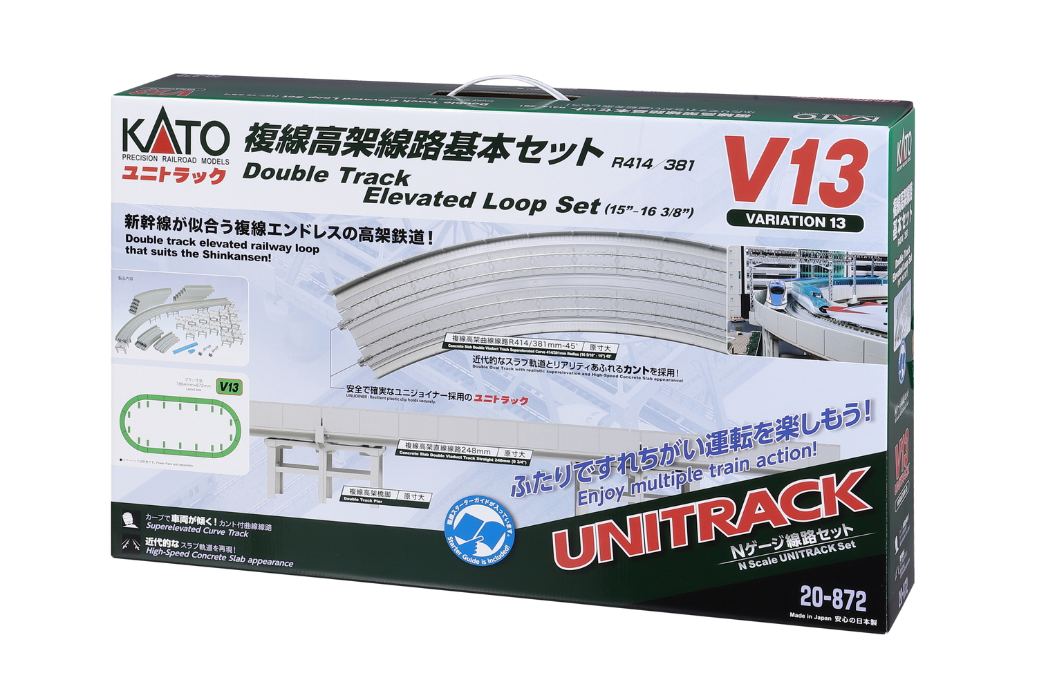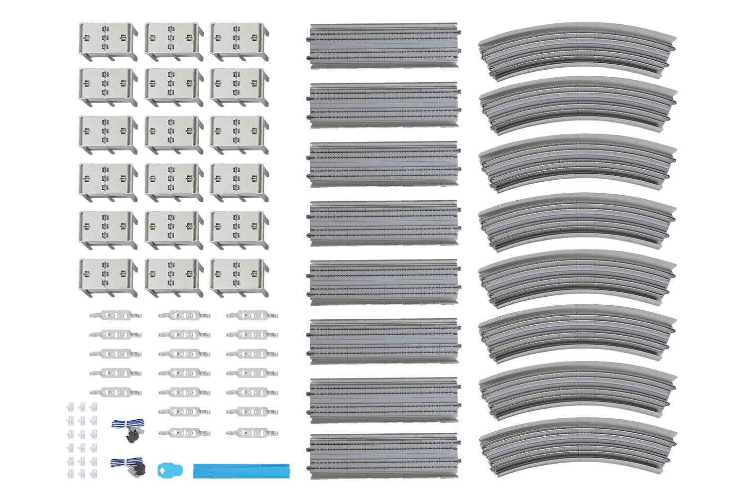 2-gleisige Viadukt-Schleife. Inhalt: 8 x Gleis mit Betonschwellen gerade 248 mm 2-gleisig, 6 x Gleis mit Betonschwellen gebogen und überhöht R414/381 mm 45° 2-gleisig, 2 x Gleis mit Betonschwellen gebogen und überhöht links R414 / 381 mm 22,5° 2-gleisig, 2 x Gleis mit Betonschwellen gebogen und überhöht rechts R414 / 381 mm 22,5° 2-gleisig, 18 x Doppel-Viadukt-Pfeiler, 2 x Viadukt Doppelgleis Anschusskabel, 1 x Aufgleishilfe / UniJoiner-Entferner (UniJoiner = Schienenverbindung)