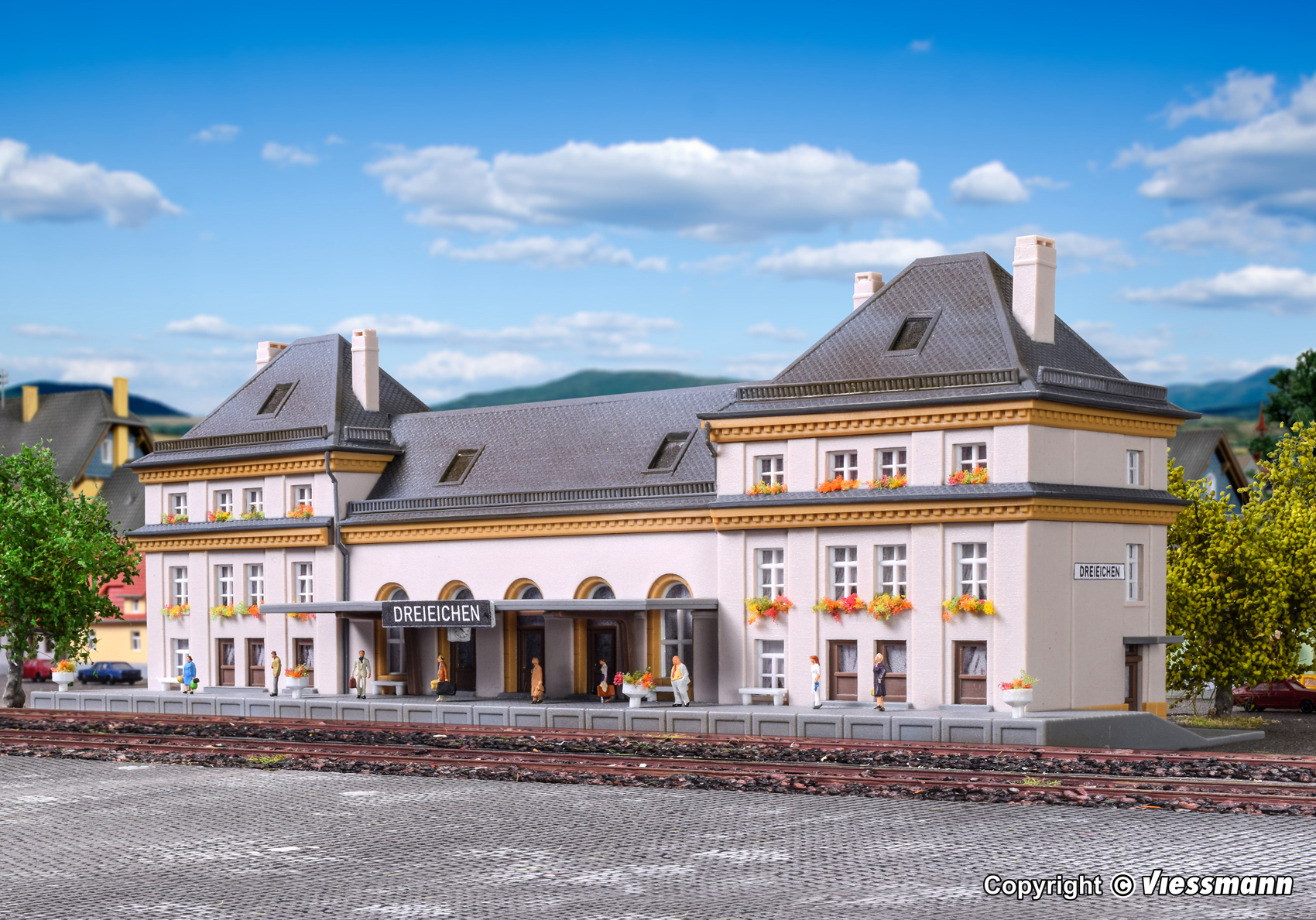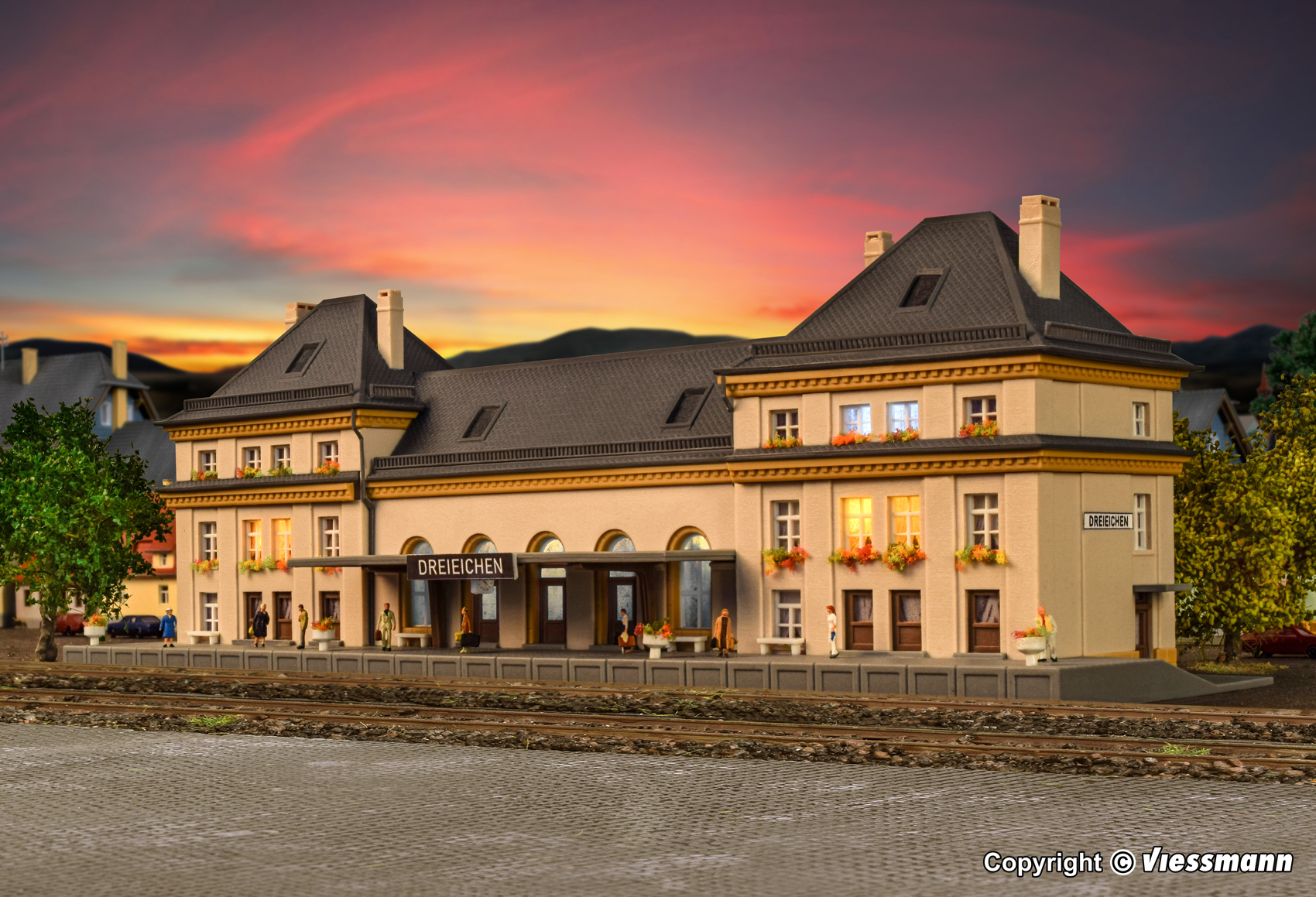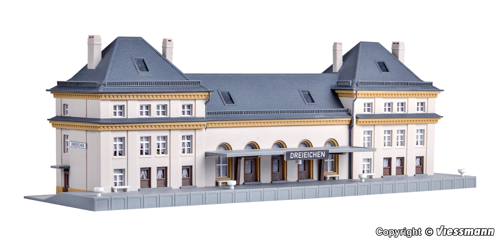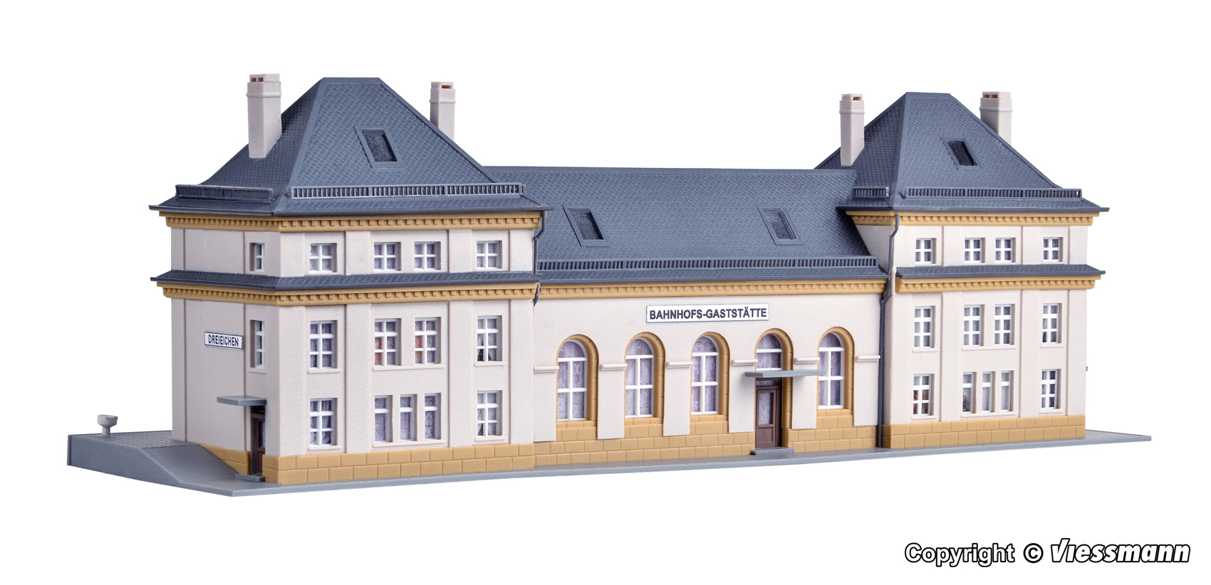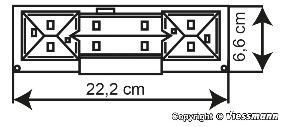 Bausatz. Mit seinen beiden betonten Eckbauten, die den mittleren Bauteil um Stockwerkhöhe überragen, entspricht das kibri-Modell dem großen Vorbild in allen wichtigen Einzelheiten. Kontrastreich aber nicht aufdringlich heben sich die hellen Wandteile von den dunkelgrauen Dachformen ab. Das Modell besticht durch seine symmetrische Architektur. Maße: L 22,2 x B 6,6 x H 7,5 cm. Schwierigkeitsgrad: 2 (Fortgeschrittene).