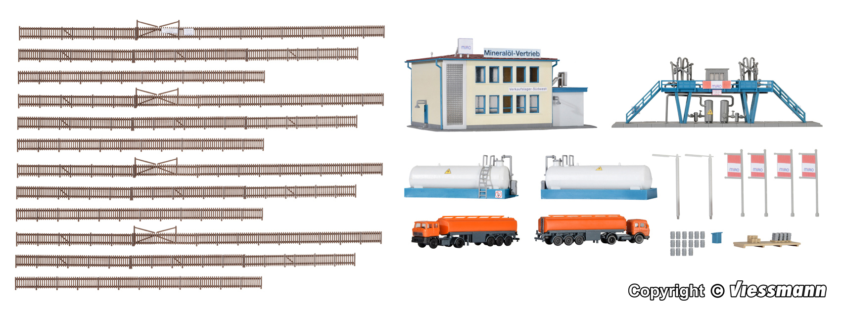 Bausatz. Die MIRO Mineralölanlage von kibri ist so konzipiert, dass sie sich aus einzelnen Bausteinen individuell zusammenstellen lässt. So lassen sich die Anlagenteile problemlos in jede beliebige Modellbahnanlage einpassen. Der angelieferte Treibstoff (z. B. leichtflüchtiges Benzin oder Rohöl) wird zur Zwischenlagerung im Hochtank der Tankanlage Art. 36726 gelagert, bevor er an dieser Abfüllstation in den SCANIA Tankwagen gefüllt und von dort zu den Verbrauchern transportiert wird. Der Bausatz enthält das Hauptgebäude, 2 Tanksattelauflieger in oranger Farbgebung der Firma KLETT Mineralöle, 2 Tanks, die Abfüllanlage, Paletten, Fässer, Fahnen und Zäune. Maße: Abfüllanlage mit Büro: L 10 x B 6,5 x H 5 cm, Tanks: je L 6,5 x B 2 x H 2,4 cm, LKW: je L 6,5 x B 1,1 x H 1,5 cm. Schwierigkeitsgrad: 2 (Fortgeschrittene).