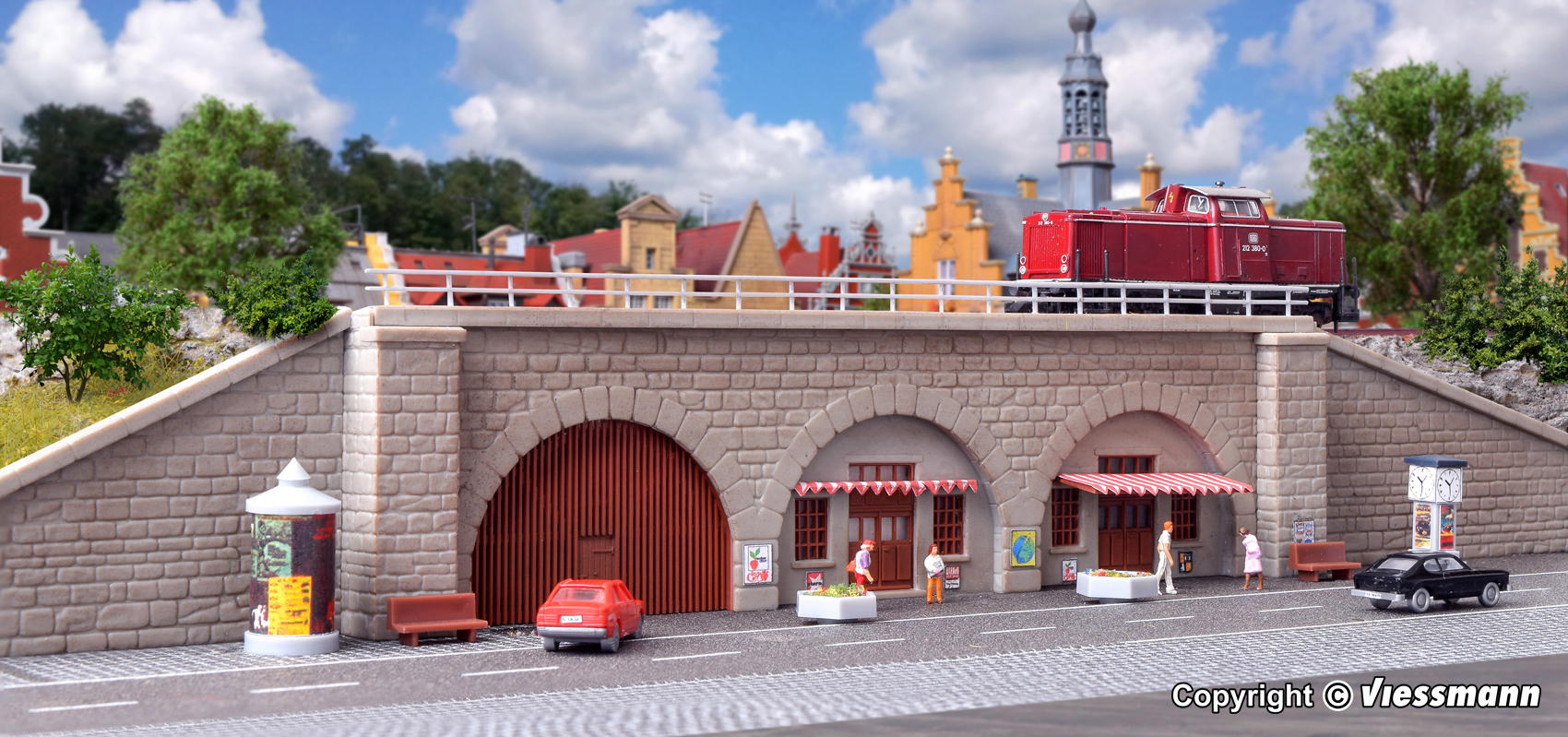 Bausatz. Mit unterschiedlich gestalteten Bogeneinsätzen. Geeignet für alle gängigen Gleissysteme in den Spurgrößen N und Z. Maße: L 34,5 cm x B 1,2 cm x H 5,2 cm. Schwierigkeitsgrad: 1 (Einsteiger).