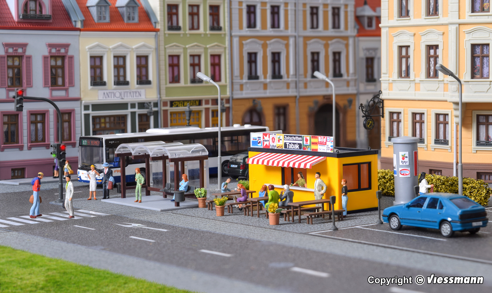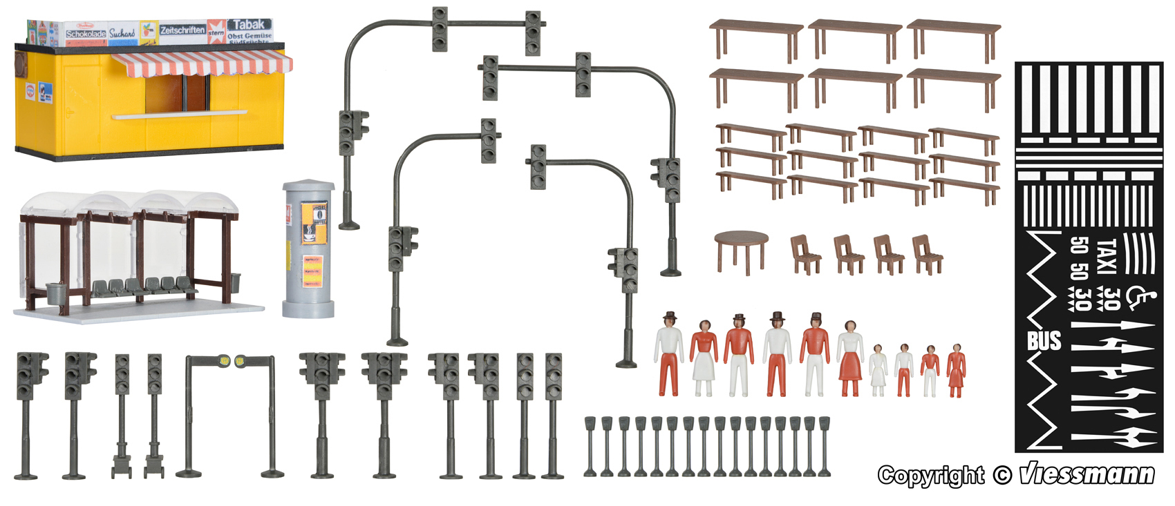 Bausatz. Diese Ausgestaltungsteile gehören zum Erscheinungsbild von Plätzen oder Straßenzügen innerhalb städtischer Gemeinden. Das Set besteht aus überdachter Bushaltestelle, Haltestellenschild, Litfaßsäule mit Flachdach, verschiedenen Verkehrsampeln und 16 Parkuhren, ein Kiosk, Tischen, Bänken, Stühlen, rundem Tisch, dazu 3 Haftetiketten mit aufgedruckten Plakaten und anderen Werbeträgern zum Bekleben des Kiosk oder der Litfaßsäule und Straßenmarkierungen in weiß (Richtungspfeile, Fußgängermarkierungen u.a.) und 10 stehenden Figuren. Schwierigkeitsgrad: 1 (Einsteiger).
