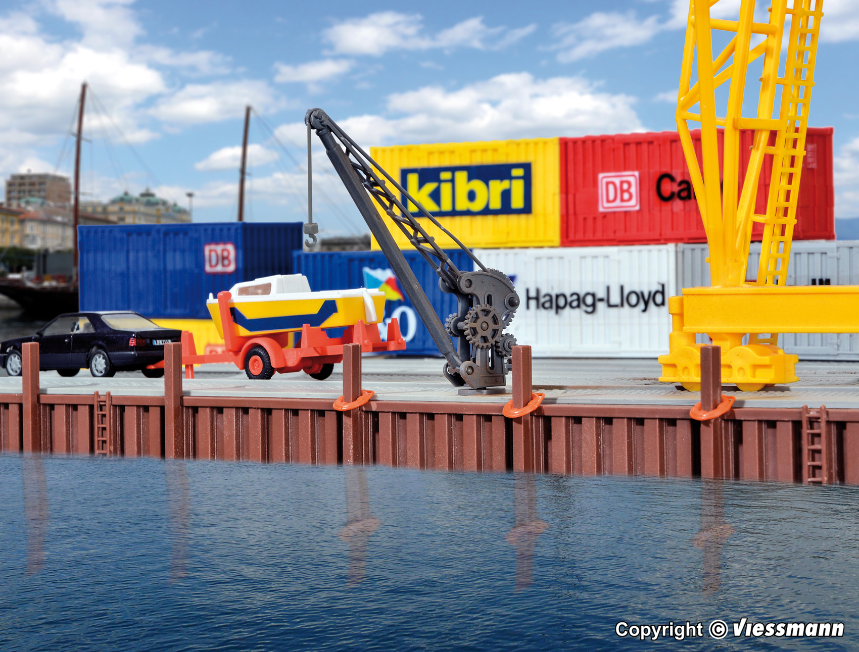 Bausatz. Ob Spundwände aus Bohlen oder gemauerte Dammstücke ? mit diesen Stützmauern lässt sich eine Vorbildsituation an einem Hafenbecken oder Bahndamm hervorragend im Modell wiedergeben. Neben den Kaimauern beinhaltet das Set diverse andere Kleinteile, z. B. Rettungsringe. Mit dem handbetriebenen Hafenkran lässt sich ein kleines Motorschiff oder eine Segeljacht wirklichkeitsnah vom Bootsanhänger zu Wasser lassen. Maße: L max. 119,5 cm x H max. 6 cm. Schwierigkeitsgrad: 1 (Einsteiger).