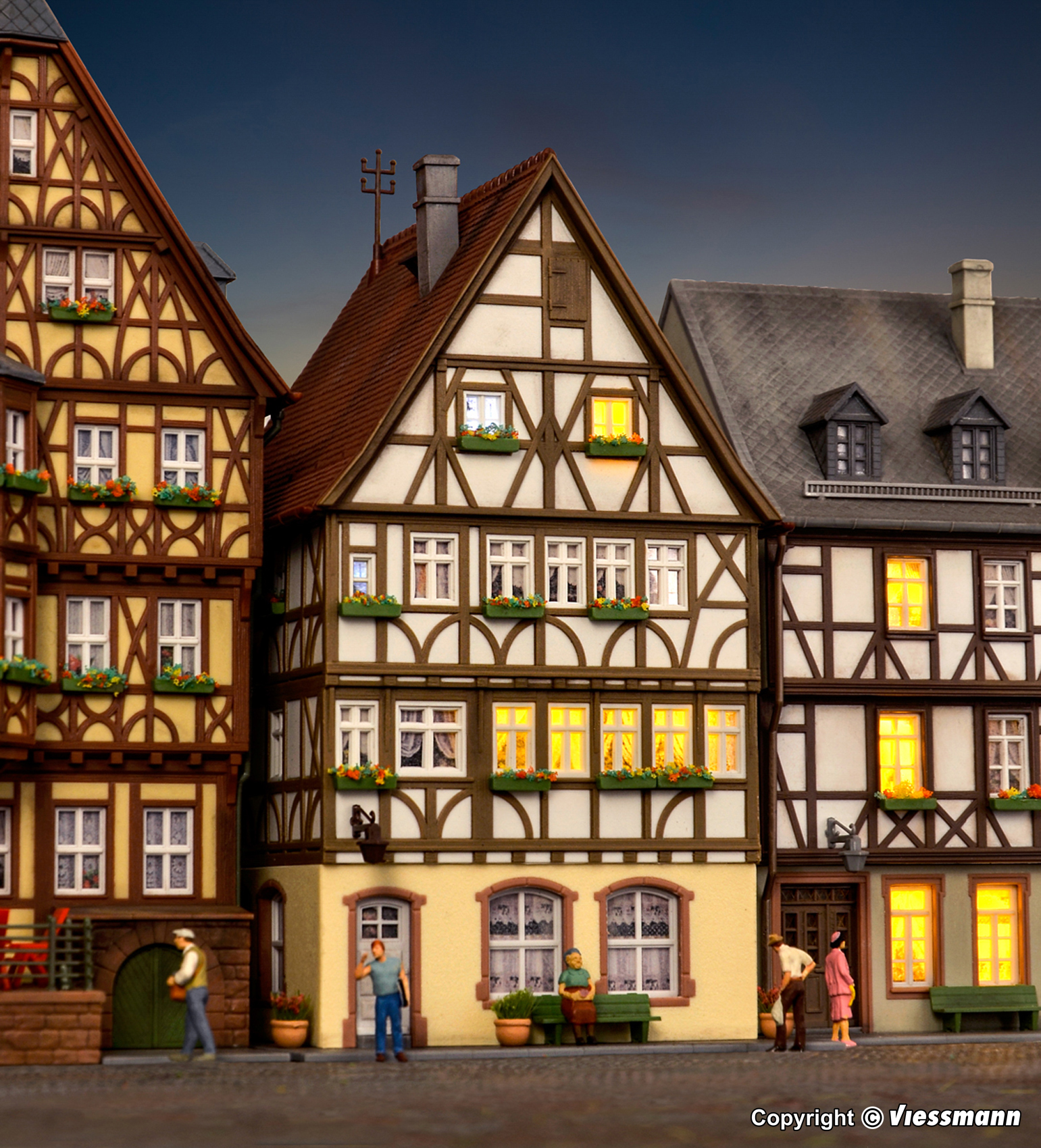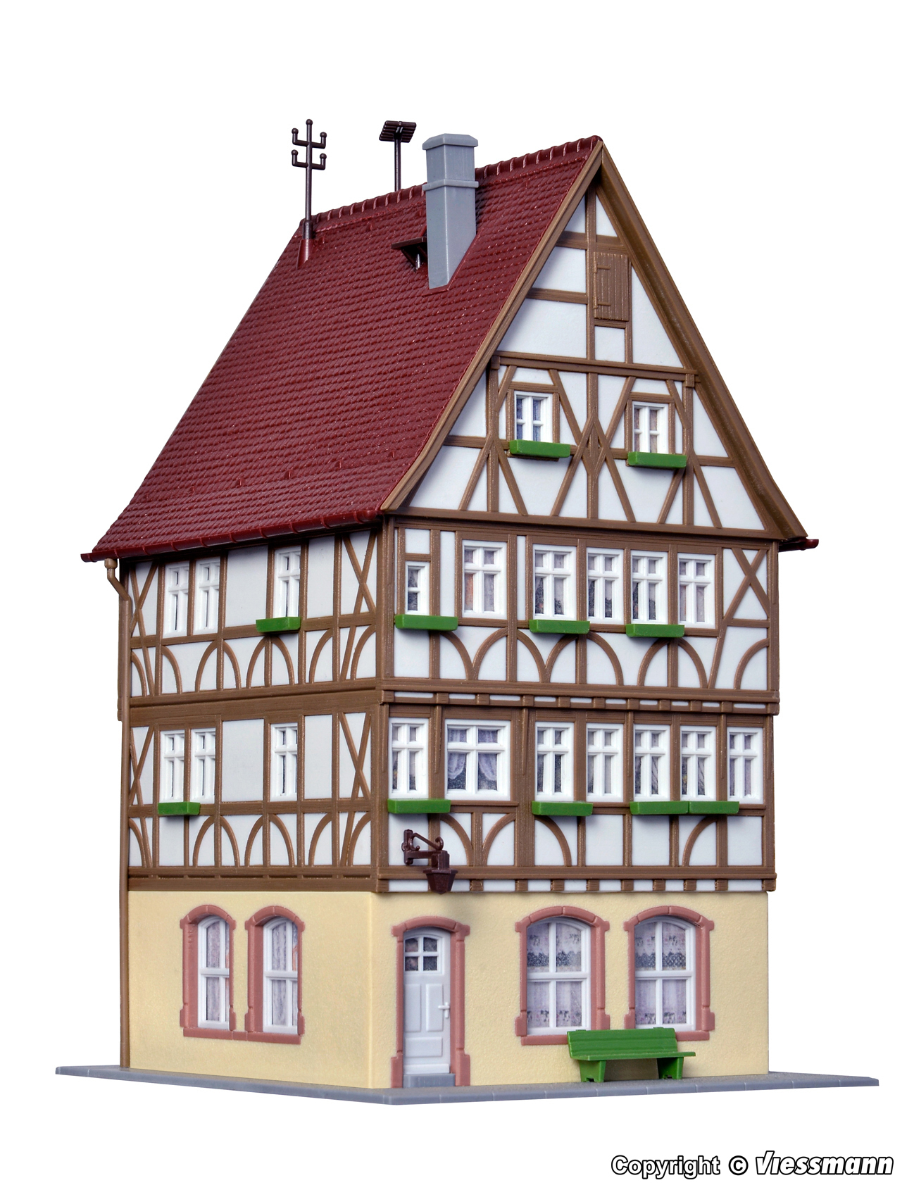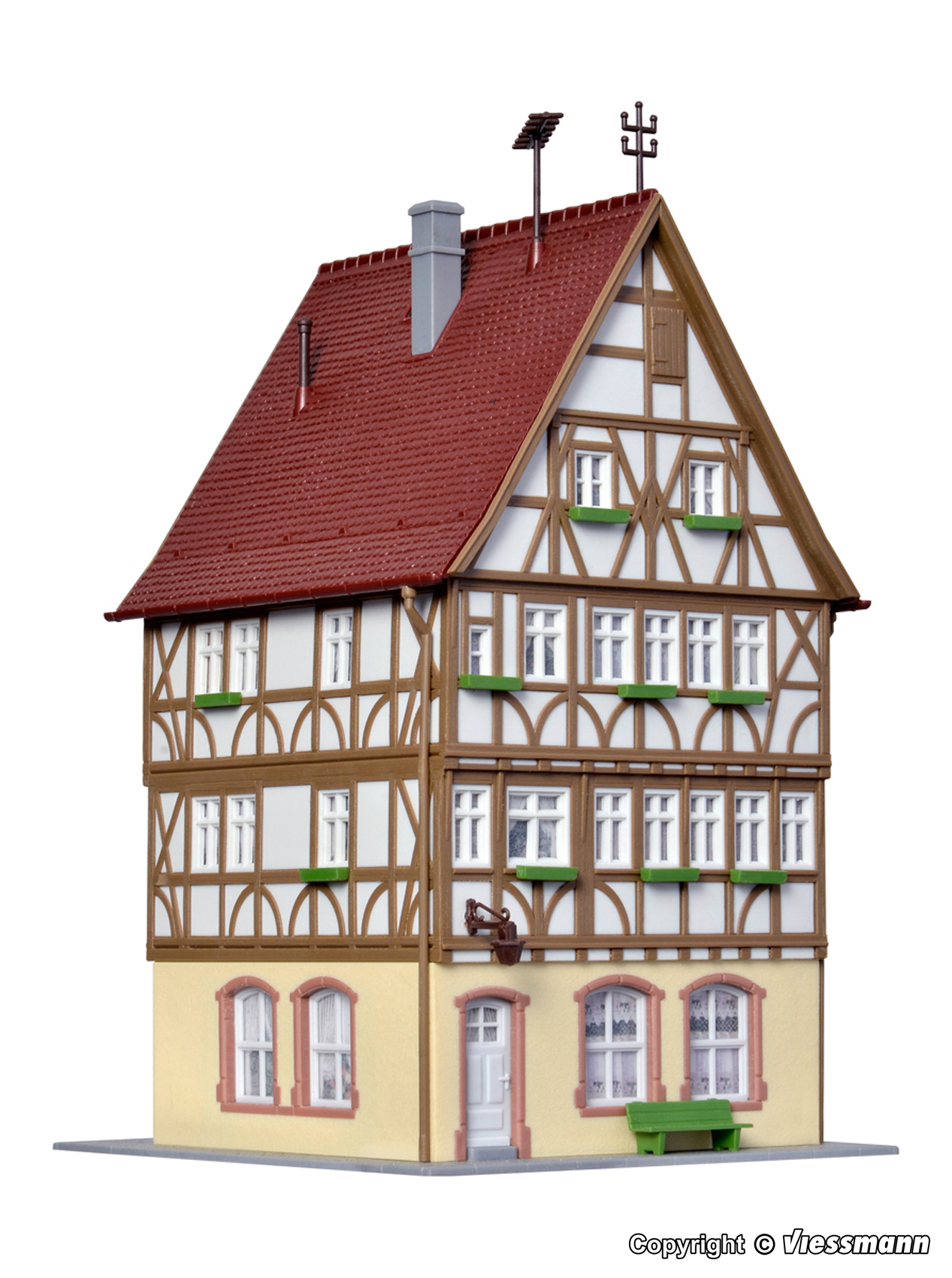 Bausatz. Die besondere Eigenart und die reiche Vielfalt der fränkischen Fachwerkbauten gipfeln in den ausgewählten Häusern am Marktplatz von Miltenberg am Main. Die Originale sind am Anfang des 16. Jahrhunderts entstanden. In ihrem Gleichklang von Zweckmäßigkeit und harmonischem Aufbau unterscheiden sich die vier Häuser wohltuend von manchen anderen Gebäuden. Bei häufig eng gezogenen Grundstücksgrenzen in mittelalterlichen Städten blieb den Erbauern nur in der Vertikalen eine hinreichende Ausdehnungsmöglichkeit. Charakteristisch für die fränkische Fachwerkbauweise ist die schmale Ständerordnung der Fachwerkkonstruktion und die auffällige Betonung der vertikalen Gefügeelemente. Das Miltenberger Ensemble von kibri besteht aus 4 harmonisch gestalteten Fachwerkbauten. Neben dem Fachwerkhaus am Markt gibt es das Haus mit Erker Art. 38902, das Fachwerk-Eckhaus Art. 38904 und das Torhaus Art. 38901. Die Hölzer zeigen im Modell braune und rotbraune Farben in unterschiedlichen Tönungen, die den Kontrast zu den hellen, meist weißen Gefachen betonen. Das kommt besonders im gewählten H0-Maßstab zur Geltung. Die Miltenberger Häuser lassen sich sehr wirkungsvoll mit bereits vorhandenen Stadthäusern von kibri kombinieren. Mit Stecksystem. Hergestellt im Zweifarben-Spritzgießverfahren. Maße: L 9,8 x B 11 x H 17,5 cm. Schwierigkeitsgrad: 2 (Fortgeschrittene).