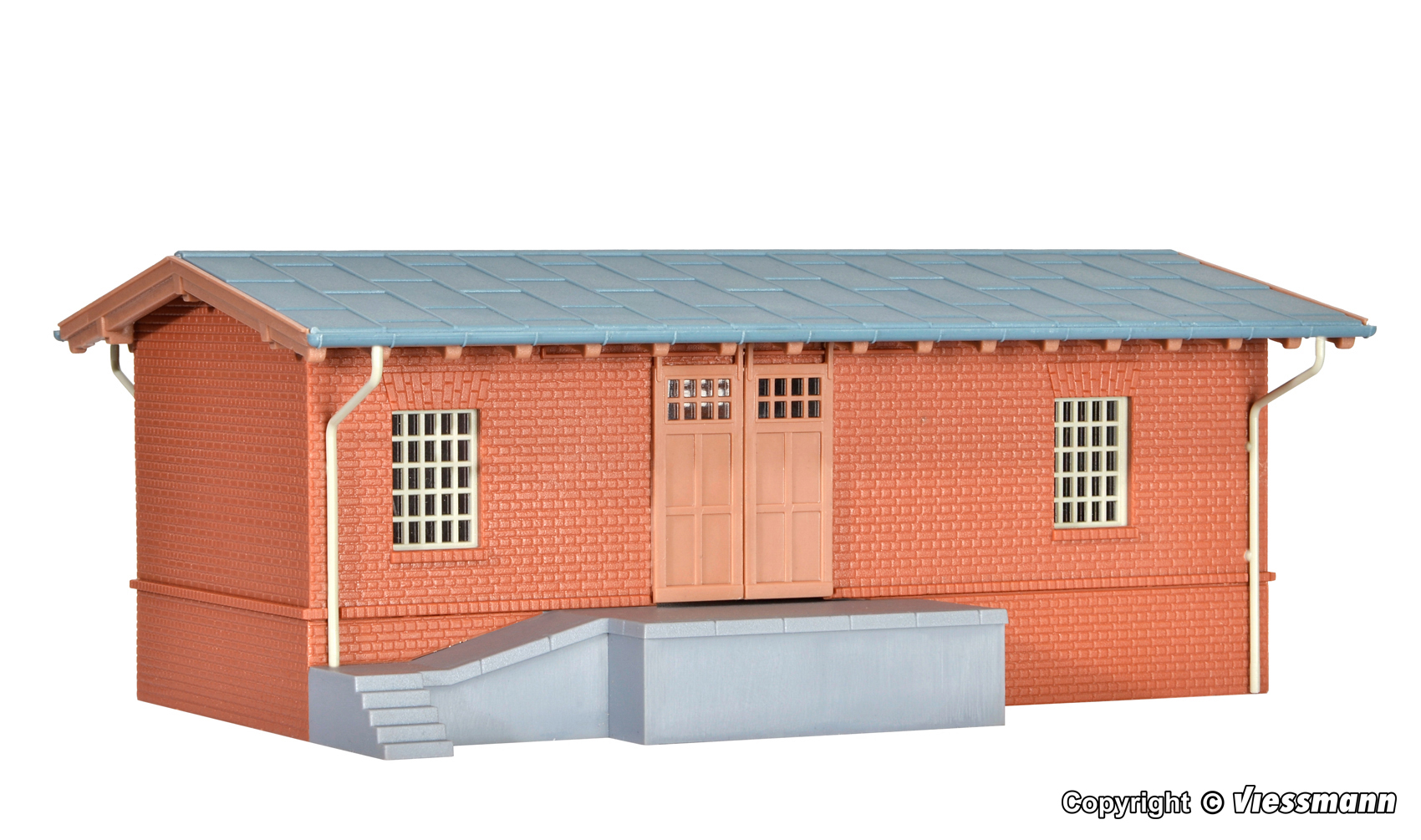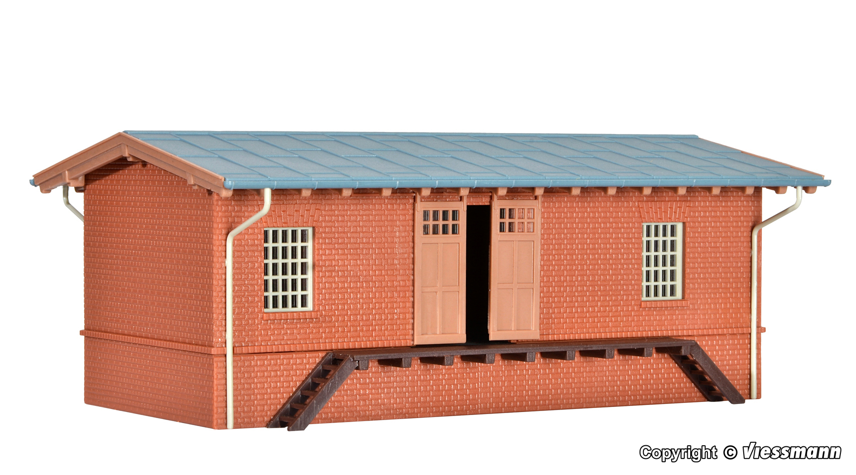 Bausatz. Kleiner Güterschuppen mit Verladerampe zur Unterbringung von Stückgut. Mit Stecksystem. Hergestellt im Zweifarben-Spritzgießverfahren. Maße: L 16,2 x B 11,5 x H 6,5 cm. Schwierigkeitsgrad: 2 (Fortgeschrittene).