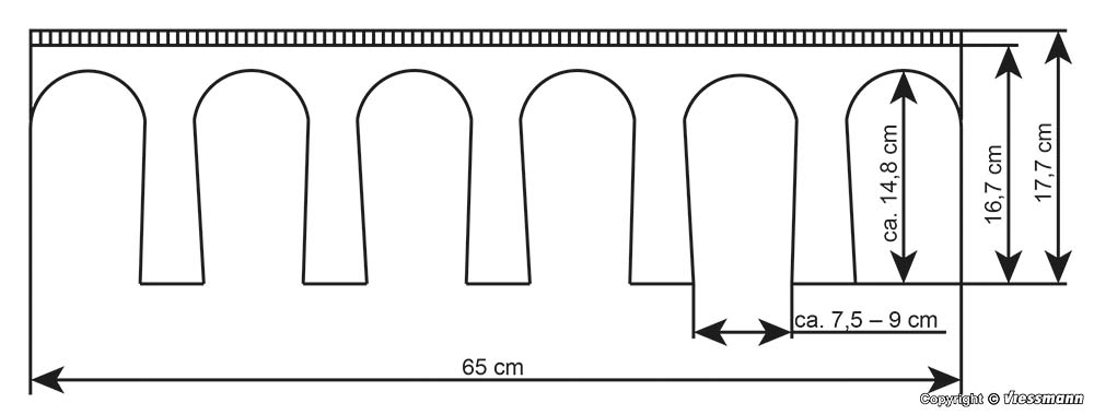 Bausatz. Für alle gängigen Gleissysteme geeignet. Zweigleisiger Aufbau mit Art. 39725 möglich. Radius = 415 ? 425 mm, 90°. Durchfahrtshöhe: 14,8 cm. Durchfahrtsbreite: 7,5 ? 9 cm. Maße: L 65 x B 8 x H 17,7 cm, Fahrbahnhöhe 16,7 cm. Schwierigkeitsgrad: 2 (Fortgeschrittene).