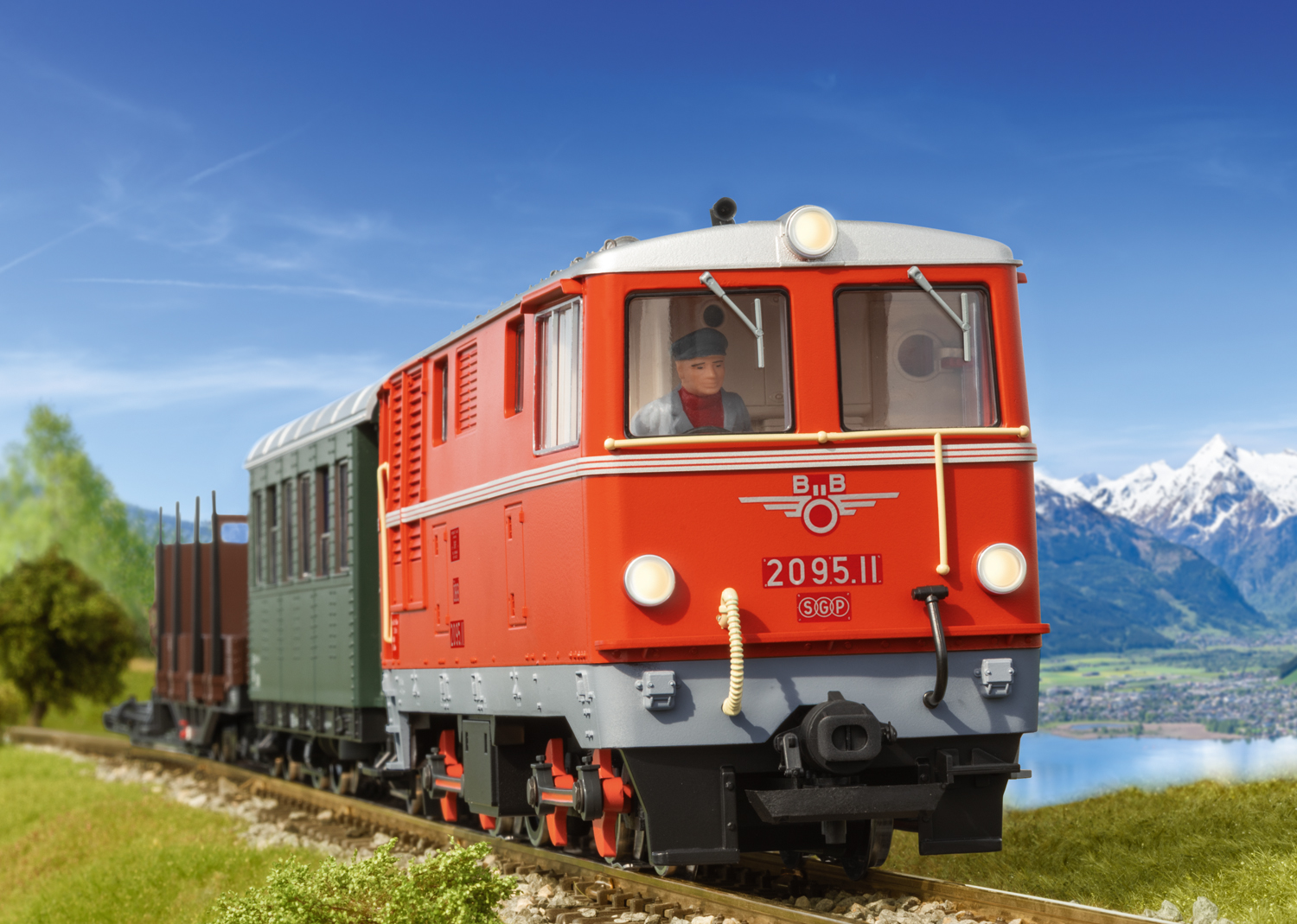 Diesellokomotive Rh 2095 - Auf den Ende der 50er-Jahre von den ÖBB betriebenen Schmalspurbahnen mit 760 mm Spurweite waren zum großen Teil noch Dampfloks im Einsatz, die schon ein beträchtliches Alter hatten. Um den Betrieb auf diesen Strecken rationeller zu gestalten, beschloss die ÖBB entsprechende Dieselloks zu beschaffen. So wurden in den Jahren 1958 bis 1962 insgesamt 15 Stück der Baureihe 2095 von Simmering-Graz-Pauker geliefert. Diese vierachsigen Loks von 31 Tonnen Gewicht und 10,40 Meter Länge konnten mit ihren 600 PS und ihrer Höchstgeschwindigkeit von 60 km/h eine deutliche Beschleunigung des Zugbetriebs bewirken. Typisch für diese kleinen, aber kompakten Loks ist der Stangenantrieb in den Drehgestellen – dies war erforderlich, da in jedem Drehgestell nur ein Radsatz direkt über das Getriebe angetrieben werden konnte. Übrigens war die Aufteilung des Lokkastens bei den ersten 3 Loks – den Prototypen – anders als bei der Serie, da diese noch einen Dampfheizkessel erhalten hatten, der dann aber in der Serie nicht mehr zum Einbau kam. Auch heute noch – mit 65 Jahren – sind diese Loks noch unterwegs, vor allem auf der Pinzgaubahn, aber auch auf anderen Schmalspurbahnen in Österreich. Modell einer Diesellok der Baureihe 2095 der ÖBB wie sie auf vielen Schmalspurbahnen in Österreich eingesetzt wurde und teilweise immer noch wird.Originalgetreue orange Farbgebung und Beschriftung der Epoche IV. Vier Radsätze von zwei leistungsstarken Motoren angetrieben. Ausgerüstet mit einem mfx/DCC-Decoder mit vielen Licht- und Soundfunktionen. Neue eingesetzte Fenster, Beleuchtung mit Leuchtdioden. Länge über Kupplung 45 cm. Zusammen mit dem Personenwagen 34621, dem Rungenwagen 43621 und dem Rollwagen 49184 kann ein typischer Zug nachgebildet werden, wie er in den 1970er-Jahren auf der Pinzgauer Lokalbahn im Einsatz war. Diese Lok wird zusammen mit den passenden Wagen anlässlich dem 125-jährigen Jubiläum der Pinzgauer Lokalbahn vorgestellt.