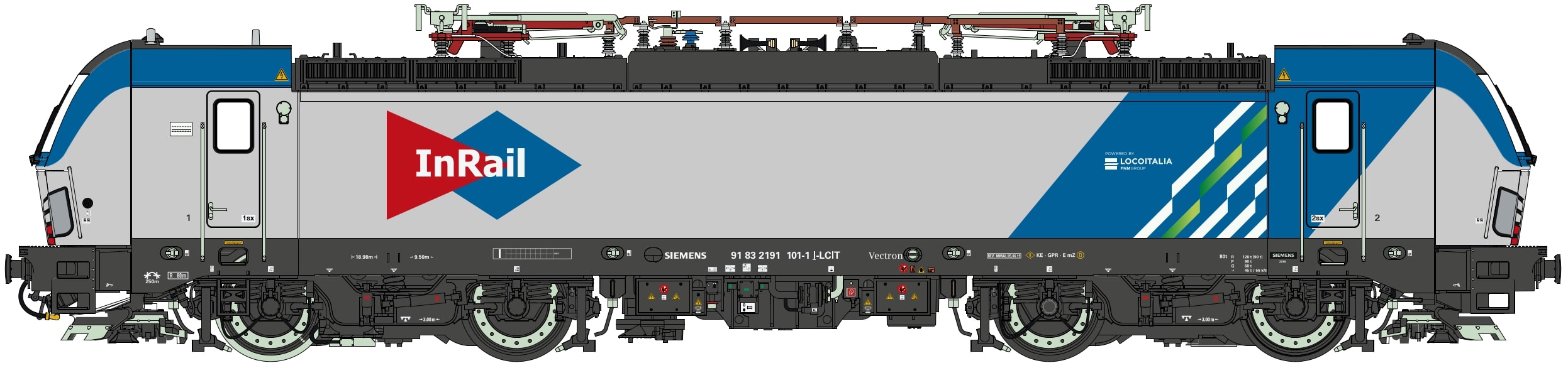 DCC Sound E-Lok Siemens Vectron DC "Last Mile", der InRail, grau / hellblau, hellblaue Front, InRail-Logo, "POWERED BY LOCOITALIA FNM Group", 2 Dachstromabnehmer, Betriebsnummer 91 83 2191 101-1 I-LCIT, für die Epoche 6.