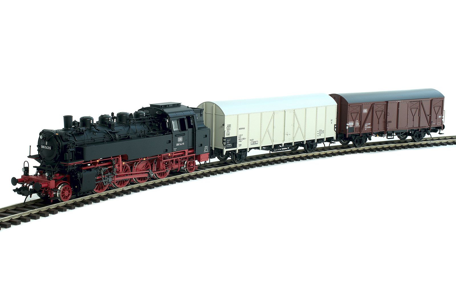 Güterzug-Set mit einer Dampflok der Baureihe 86 050 der deutschen Bundesbahn in der Epoche 4, (BD Saarbrücken Bw Mayen) mit je einem Güterwagen Güterwagen Gs 211 und Kühlwagen Ibdlps 383, DB, Epoche 4.