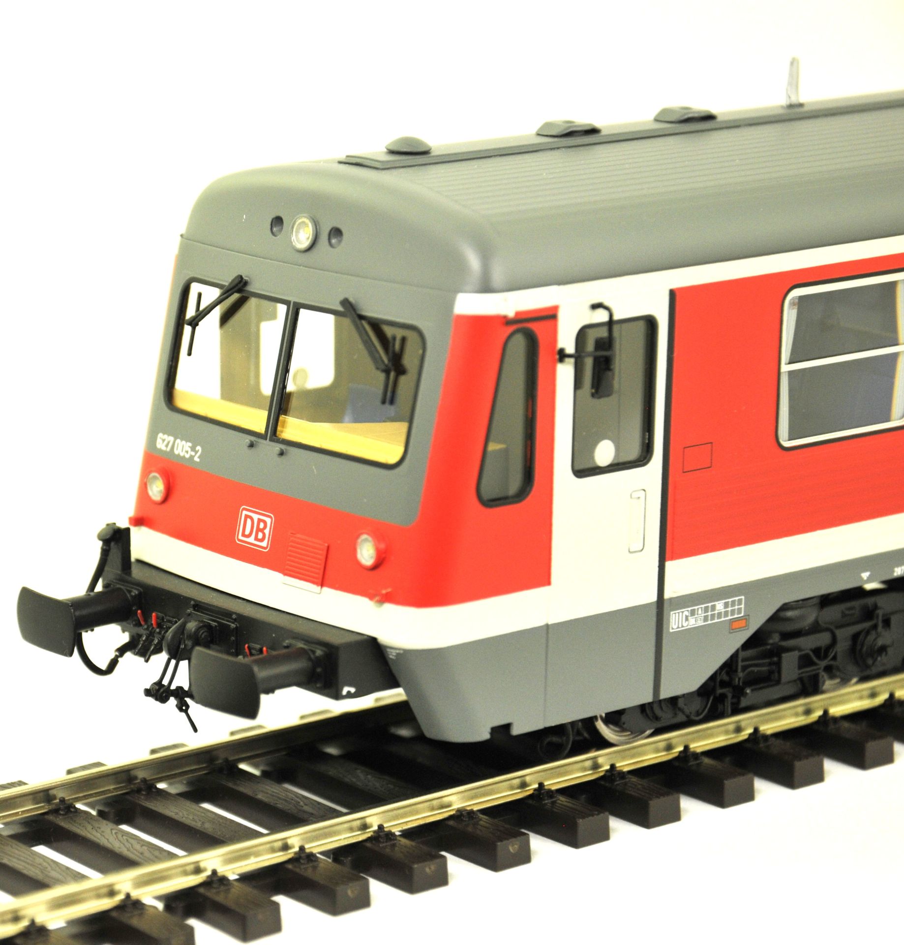 Wir bringen nun in limitierter Auflage den Triebwagen BR627 für die Freunde der Epochen 4 bis 5. Die Modelle sind komplett aus Messing gefertigt und werden von einem Glockenankermotor in einem Drehgestell angetrieben. Die Modelle sind bereits digital mit Sound, Innenbeleuchtung, richtungsabhängigen Lichtwechsel und schaltbares Rücklicht ausgerüstet. Die LüP beträgt 524 mm.