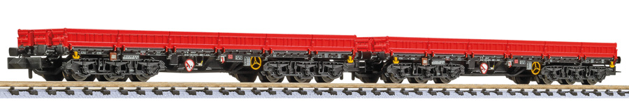 2-teiliges Set 6-achsige Schwerlastwagen, Bauart Samms-u 454 der DB AG, Betriebszustand 2003, Bordwände verkehrsrot, Fahrgestell und Drehgestelle schwarz, Betriebs-Nrn. 486 0 511-3 und 486 6 435-9, für die Epoche 5.