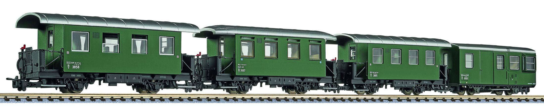 Nr. 3612 mit Tonnendach und Holzfenstern, Personenwagen Bi/s, Betriebs-Nr. 3667 mit Haubendach und Holzfenstern,