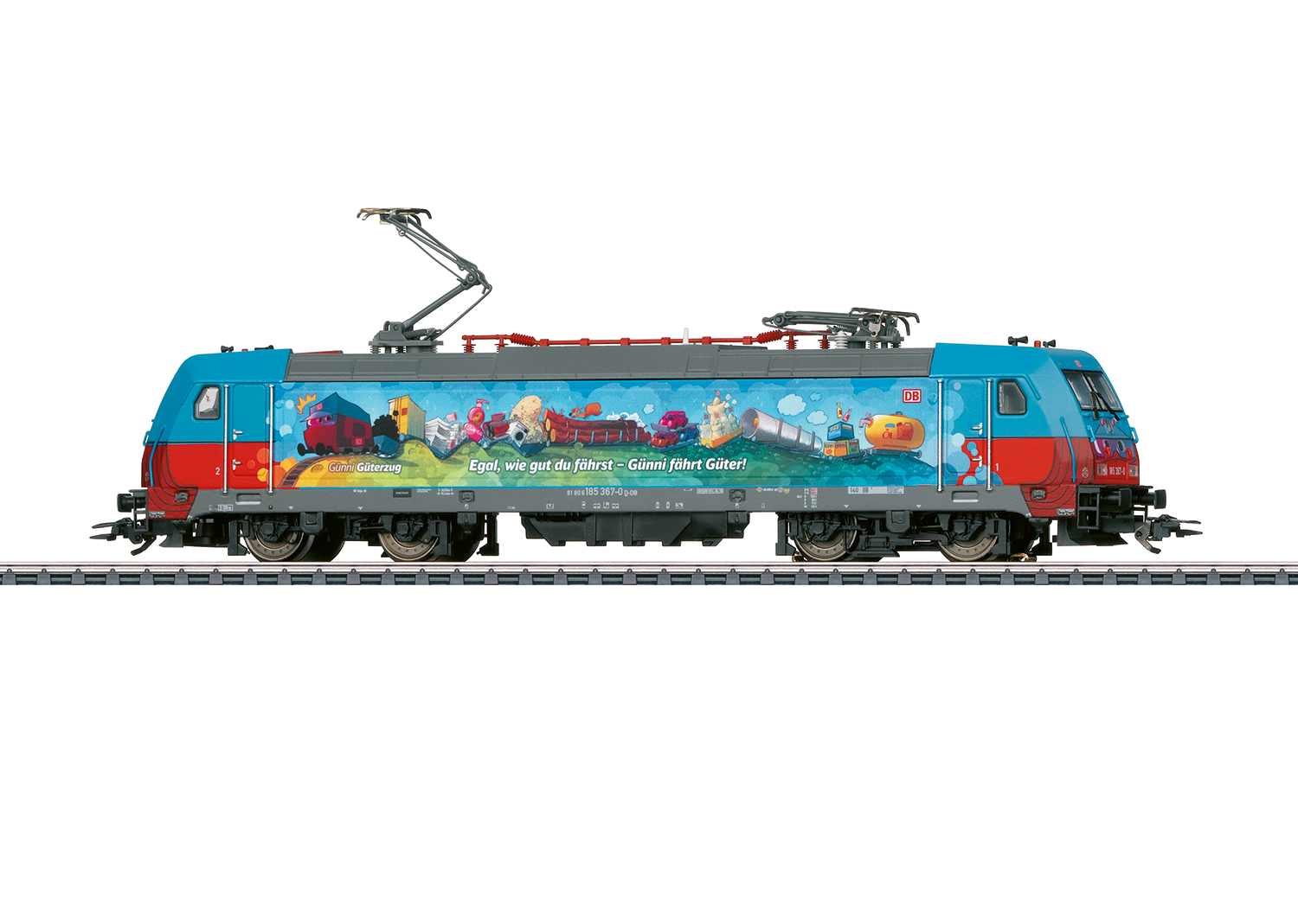 Vorbild: Elektrolokomotive Baureihe 185.2 der Deutschen Bahn AG (DB AG). Lok-Betriebsnummer 185 367-0. Betriebszustand ab September 2019 in auffälliger Werbegestaltung als "Günni Güterzug".