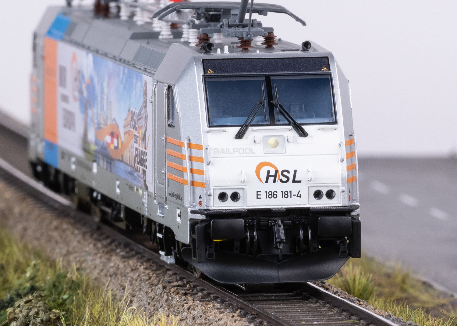 Elektrolokomotive Baureihe 186 - Vorbild: Elektrolokomotive Baureihe 186 der Railpool GmbH, vermietet an die HSL. Betriebsnummer 186 181-4. Betriebszustand ab 2018 mit attraktiver Werbegestaltung HSL - Wir verbinden Europa.Modell: Mit Digital-Decoder mfx+ und umfangreichen Geräuschfunktionen. Geregelter Hochleistungsantrieb mit Schwungmasse, zentral eingebaut. Alle vier Achsen über Kardan angetrieben. Haftreifen. Fahrtrichtungsabhängig wechselndes Dreilicht-Spitzensignal und zwei rote Schlusslichter konventionell in Betrieb, digital schaltbar. Fernlicht zuschaltbar. Spitzensignal an Lokseite 2 und 1 jeweils digital separat abschaltbar. Doppel-A-Licht-Funktion. Führerstands- und Führerpultbeleuchtung jeweils separat digital schaltbar. Beleuchtung mit wartungsfreien warmweißen und roten Leuchtdioden (LED). Mit Pufferspeicher. Viele separat angesetzte Teile wie Griffstangen, Sandkästen, UIC-Steckdosen und Dachleitungen. Detailliert ausgeführte Dachaufbauten mit vier neu konstruierten Stromabnehmern mit unterschiedlichen Schleifstücken für den Einsatz in Deutschland, Belgien, den Niederlanden und Österreich. Pufferhöhe nach NEM. Bremsleitungen, Schraubenkupplungen, Steckdosen und geschlossene Schienenräumer liegen als separat ansteckbare Teile bei. Länge über Puffer 21,7 cm.Passende Güterwagen der Epoche VI finden Sie im Märklin H0-Sortiment.Dieses Modell finden Sie in Gleichstromausführung im Trix H0-Sortiment unter der Artikelnummer 25803.