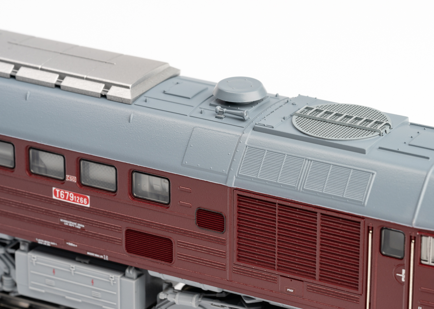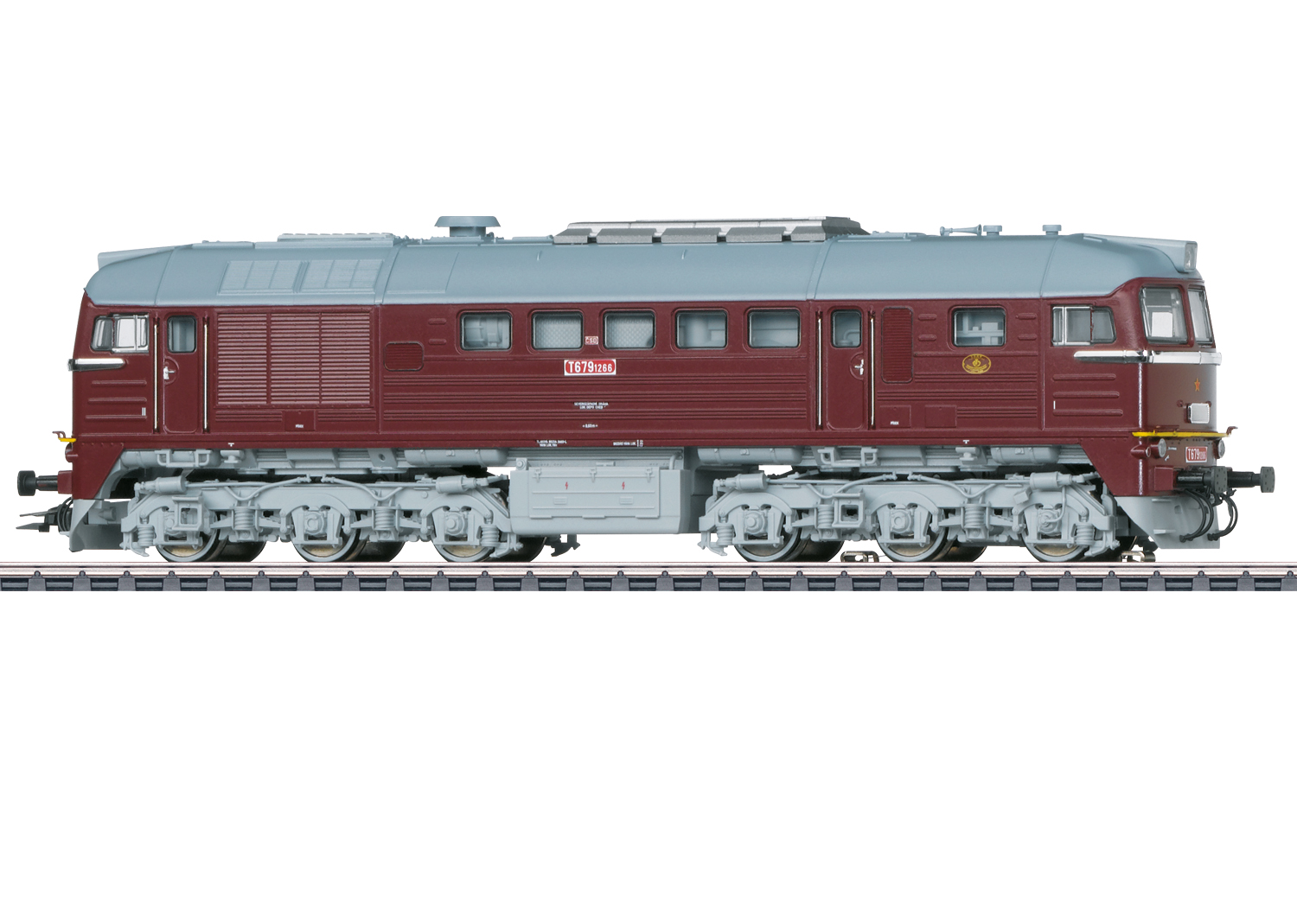 Diesellokomotive T 679.1266 - Vorbild: Diesellokomotive T 679.1266 der Tschechoslowakischen Staatsbahnen CSD, auch bekannt unter dem Spitznamen äTaigatrommel“. Mit Schalldämpfer sowjetischer Bauart, Ansauggitter mit waagerechten Lamellen und Kühlerlüfter mit Gitter. Betriebszustand um 1980.Modell: Mit Digital-Decoder mfx+ und umfangreichen Geräuschfunktionen. Geregelter Hochleistungsantrieb zentral eingebaut. Jeweils zwei Achsen in jedem Drehgestell über Kardan angetrieben. Haftreifen. Fahrtrichtungsabhängig wechselndes Dreilicht-Spitzensignal und 2 rote Schlusslichter konventionell in Betrieb, digital schaltbar. Spitzensignal an Lokseite 2 und 1 jeweils separat digital abschaltbar. Wenn Spitzensignal an beiden Lokseiten abgeschaltet ist, dann beidseitig Funktion des Doppel-A-Lichts. Führerstandbeleuchtung mit der Fahrtrichtung wechselnd, digital schaltbar. Maschinenraumbeleuchtung digital schaltbar. Beleuchtung mit wartungsfreien warmweißen und roten Leuchtdioden (LED). Seitlich angesetzte Griffstangen aus Metall. Frontschürzen gegen geschlossene Frontschürzen austauschbar. Länge über Puffer ca. 20,2 cm.Ein passendes Wagen-Set finden Sie im Märklin H0-Sortiment unter der Artikelnummer 46463.Dieses Modell finden Sie in Gleichstromausführung im Trix H0-Sortiment unter der Artikelnummer 25202.