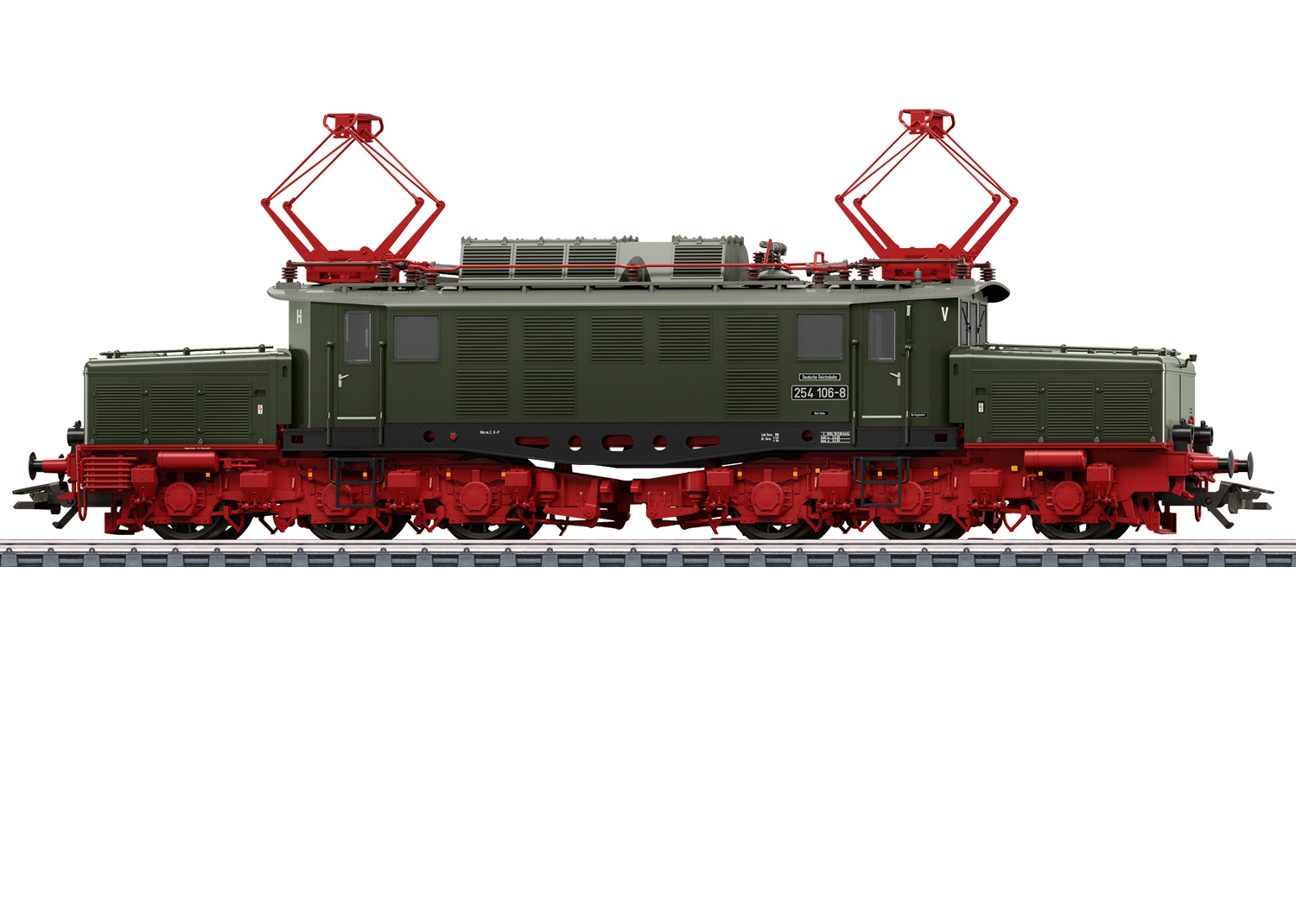 Vorbild: Schwere Güterzug-Elektrolokomotive Baureihe 254 der Deutschen Reichsbahn der DDR (DR/DDR). Flaschengrüne Grundfarbgebung