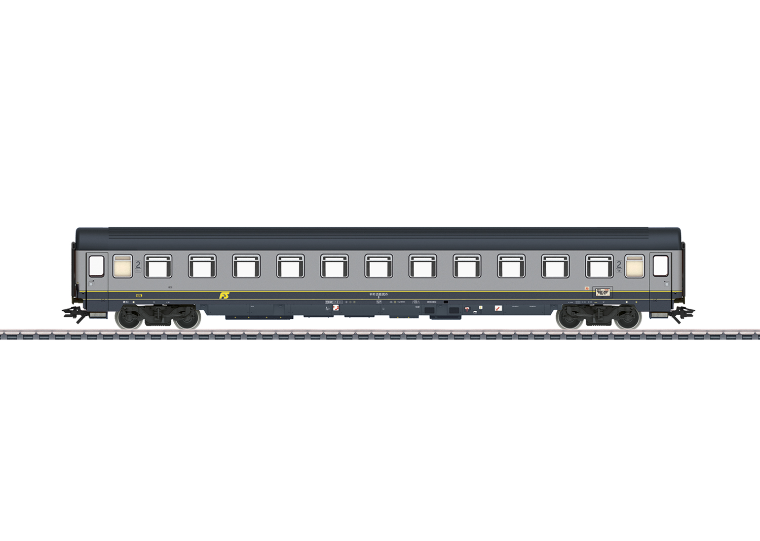 Personenwagen 2. Klasse - Vorbild: Abteilwagen 2. Klasse Bauart Bz Eurofima der Italienischen Staatsbahn (FS). In äBigrigio“-Farbgebung. Wagenlauf EC 89 Paganini: München Hbf – Innsbruck – Brennero – Bolzano – Verona. Betriebszustand um 1995.Modell: Fiat Drehgestelle Y0270 S mit Schlingerdämpfer und mit Magnetschienenbremse. Typspezifisch gestalteter Unterboden. Vorbereitet für stromführende Kupplung 7319 oder stromführende Kurzkupplung 72021 oder 72022, Innenbeleuchtung E73400/73401, 73410 oder 73411, Schleifer 73406 und Zugschlussbeleuchtung 73407. Befahrbarer Mindestradius 360 mm. Länge über Puffer ca. 28,2 cm. Gleichstromradsatz E700580.Passende Wagen finden Sie im Märklin H0-Sortiment unter der Artikelnummer 42913 und 42923.