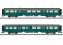 Vorbild: 2 verschiedene Personenwagen Typ M2 der Belgischen Staatsbahnen (SNCB/NMBS). 1 Personenwagen Typ M2, A, 1. Klasse. 1 Personenwagen Typ M2, A5B5, 1./2. Klasse. Moosgrüne Grundfarbgebung. Betriebszustand der Epoche IIIa.