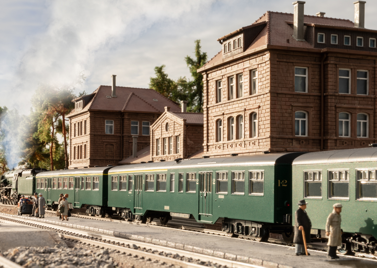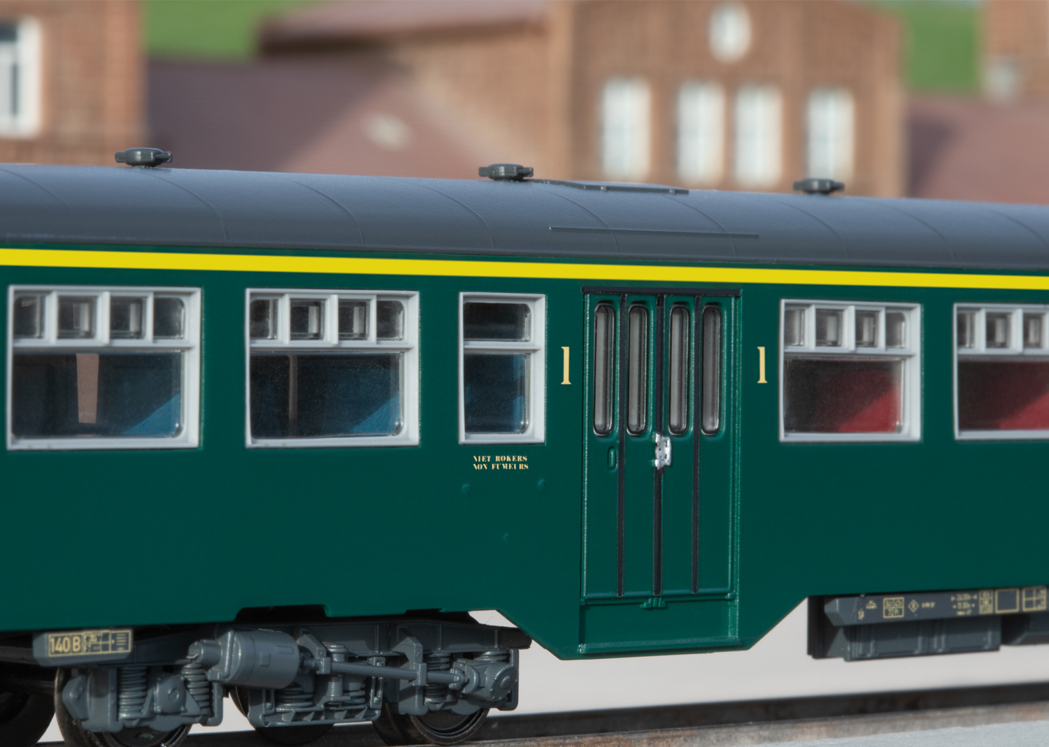 Modell: Separat eingesetzte, abgestufte Fensterrahmen. Beide Wagen mit serienmäßig eingebauter Innenbeleuchtung mit warmweißen Leuchtdioden (LED). Personenwagen 1. Klasse serienmäßig mit Schleifer ausgestattet. Über die serienmäßig eingebauten stromführenden Kurzkupplungsköpfe können beide Wagen mit Strom versorgt werden. Dazu ist eine fest definierte Wagenreihenfolge vorgegeben. Unterschiedliche Betriebsnummern. Beide Wagen einzeln verpackt, mit zusätzlicher Umverpackung. Gesamtlänge über Puffer 55,2 cm.
