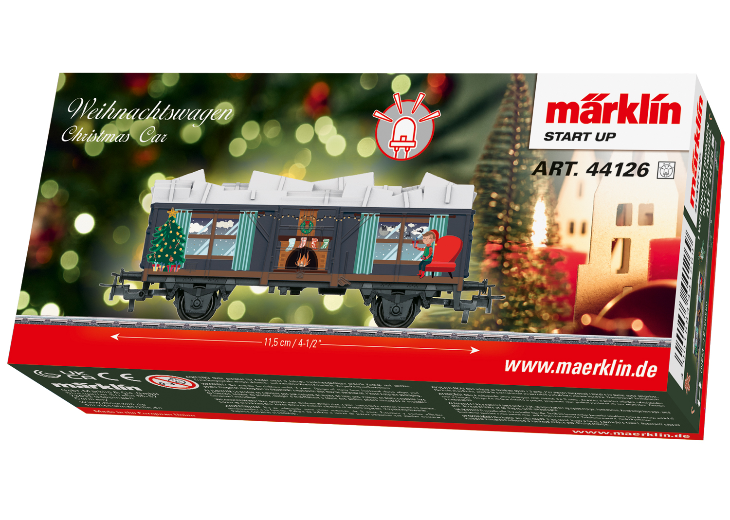Märklin Start up - Weihnachtswagen mit Lichtmodul Offener Güterwagen in einer ansprechenden Weihnachtsgestaltung. Modell: Offener Güterwagen in Weihnachtsgestaltung. Der Wagen ist mit einem batteriebetriebenen Lichtmodul beladen. Das Lichtmodul ist als beleuchtete Geschenke-Beladung gestaltet. Relex-Kupplungen. Batterien im Lieferumfang enthalten. Wagenlänge 11,5 cm. Gleichstromradsatz E700580 separat erhältlich. Der Weihnachtswagen mit Lichtmodul ist die ideale Ergänzung zur Startpackung Weihnachten 29124.