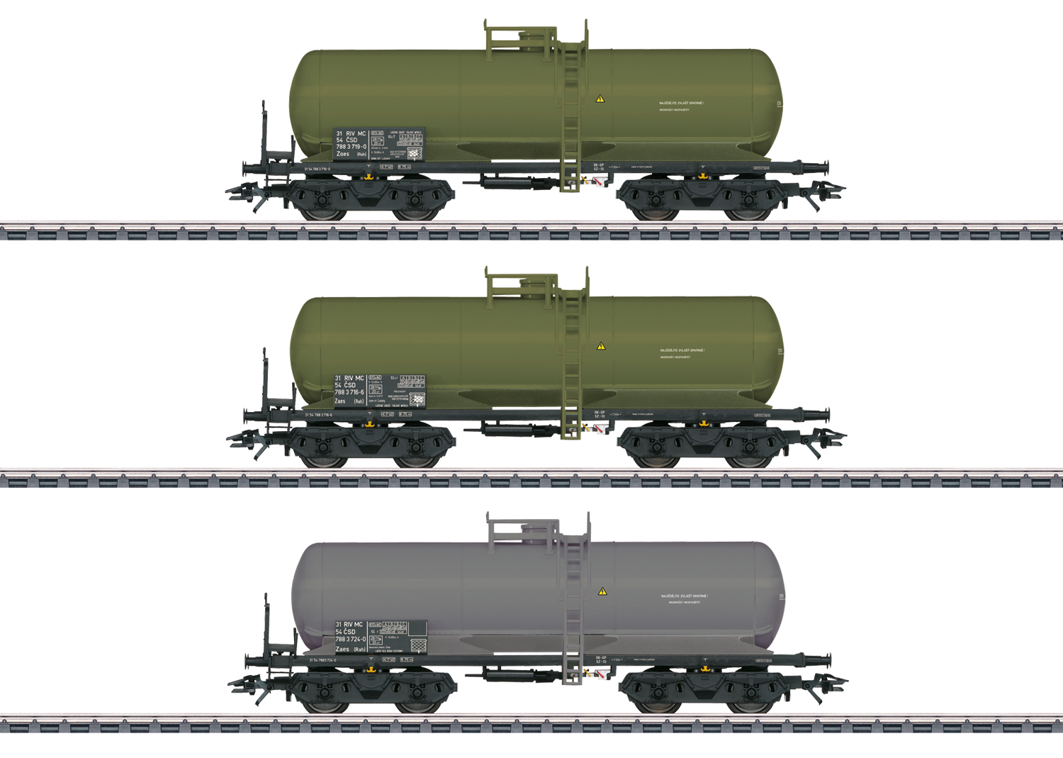 Kesselwagen-Set - Vorbild: Drei 4-achsige Kesselwagen Bauart Zaes (Rah) der Tschechoslowakischen Staatsbahnen CSD. Farbgebung in Schilfgrün, bzw. Staubgrau. Betriebszustand um 1982.Modell: Alle Wagen mit unterschiedlichen Betriebsnummern. Detaillierte Fahrgestelle mit durchbrochenem Rahmen. Außenlangträger als U-Profil mit Seilösen. Drehgestelle nach Bauart Minden-Dorstfeld. Angesetzte Arbeitsbühnen mit Aufstieg, angesetzte Bremserbühnen. Darstellung der verstärkten Pufferbohlen. Gesamtlänge über Puffer ca. 44 cm. Gleichstromradsatz E700580.Eine passende Diesellokomotive finden Sie im Märklin H0-Sortiment unter der Artikelnummer 39202.