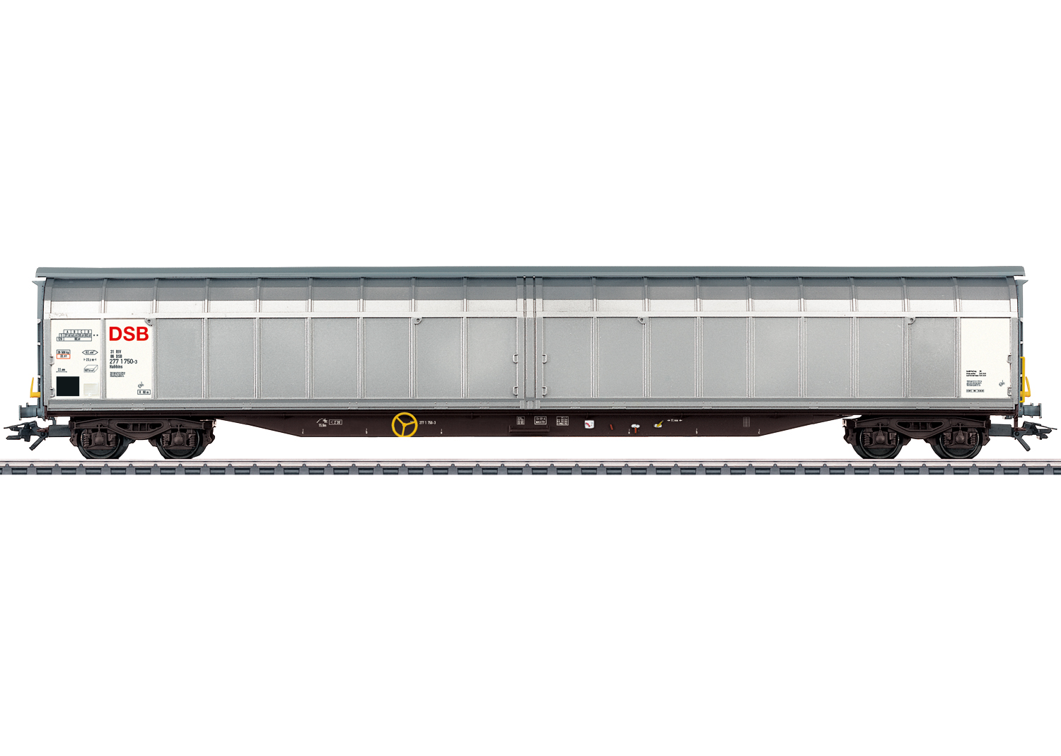 Großraum-Schiebewandwagen Habbins Vorbild: Großraum-Schiebewandwagen Bauart Habbins der Dänischen Staatsbahnen (DSB). Betriebszustand ab 1999.Modell: Verstellbare Puffer und Drehgestelle. Länge über Puffer 26,7 cm. Gleichstromradsatz E700580.