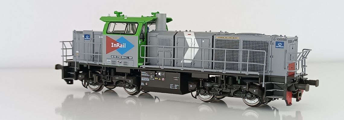 Diesellok Vossloh G1000 der InRail D100 004, grau/grün, weißes Eckband,