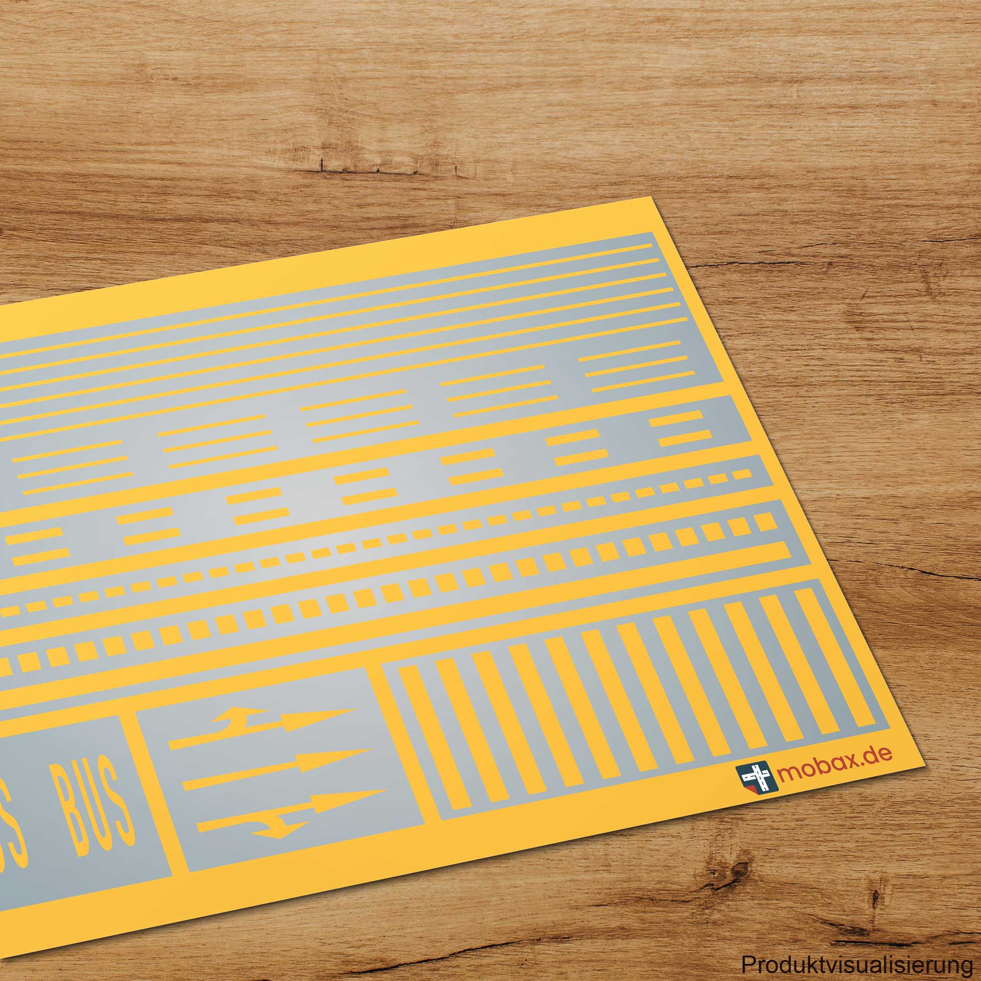 Spur N - 1:160 : Deutschland - Gelb, Stadt, Landstraße, Baustelle - Basis-Set Baustelle für die maßstabsgetreue FahrbahnmarkierungDas Set beinhaltet eine Auswahl der gängigen Markierungen (Linien, Pfeile, Schrift):Fahrbahnbegrenzung - 6Leitlinie (Schmalstrich Stadt, ohne Abstandsvorgabe) - 18unterbrochene Fahrbahnbegrenzung (z.B. Straßeneinmündungen) - 16Radfahrerfurt (Länge individuell anpassbar) - 1Wartelinie (Länge individuell anpassbar) - 1Haltelinie (Länge individuell anpassbar) - 1BUS-Schriftzug - 2Richtungspfeile - je 1Zebrastreifen (Länge individuell anpassbar) - 1Für dieses Set empfehlen wir unsere Übertragungsfolie.Anwendung:Die Linien lassen sich auf die individuellen Bedürfnisse anpassen, anordnen und zuschneiden . Lassen Sie Ihrer Kreativität freien Lauf und erschaffen Sie absolut realistätsnahe Modelle.Es handelt sich um hochwertige, selbstklebende Markierungsfolie mit sehr starker Haftung. Die flexiblen Markierungen passen sich perfekt dem Untergrund an und lassen sich in nahezu jedem Kurvenradius legen. Gestochene Randschärfe der einzelnen Elemente.