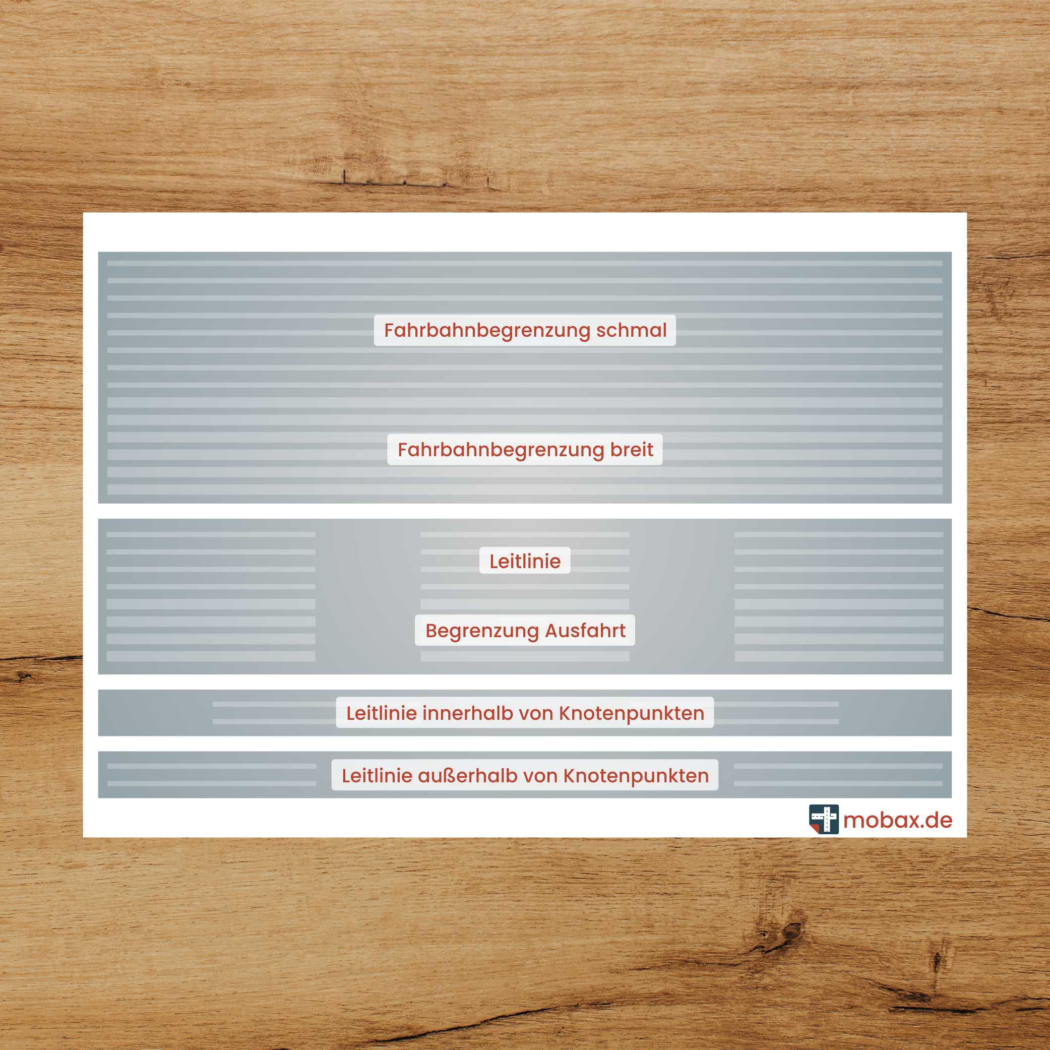 Spur N - 1:160 : Deutschland - Weiß, Autobahn - Linien-Set für die Längsmarkierungen auf Autobahnen.Die Linien entsprechen der genormten Größe für Autobahnen.Das Set beinhaltet die gängigen Längsmarkierungen inkl. Beispielen:Fahrbahnbegrenzung schmal - 8Fahrbahnbegrenzung breit (Abgrenzung zum Standstreifen) - 6Leitlinie (Schmalstrich, ohne Abstandsvorgabe) - 12Begrenzung Abbiegespur (breit, ohne Abstandsvorgabe) - 12Beispiel: Leitlinie (unterbrochener Schmalstrich innerhalb von Knotenpunkten) - 4Beispiel: normale Leitlinie (unterbrochener Schmalstrich außerhalb von Knotenpunkten) - 4Für dieses Set empfehlen wir unsere Übertragungsfolie.Anwendung:Die Linien lassen sich auf die individuellen Bedürfnisse anpassen, anordnen und zuschneiden . Lassen Sie Ihrer Kreativität freien Lauf und erschaffen Sie absolut realistätsnahe Modelle.Es handelt sich um hochwertige, selbstklebende Markierungsfolie mit sehr starker Haftung. Die flexiblen Markierungen passen sich perfekt dem Untergrund an und lassen sich in nahezu jedem Kurvenradius legen. Gestochene Randschärfe der einzelnen Elemente.