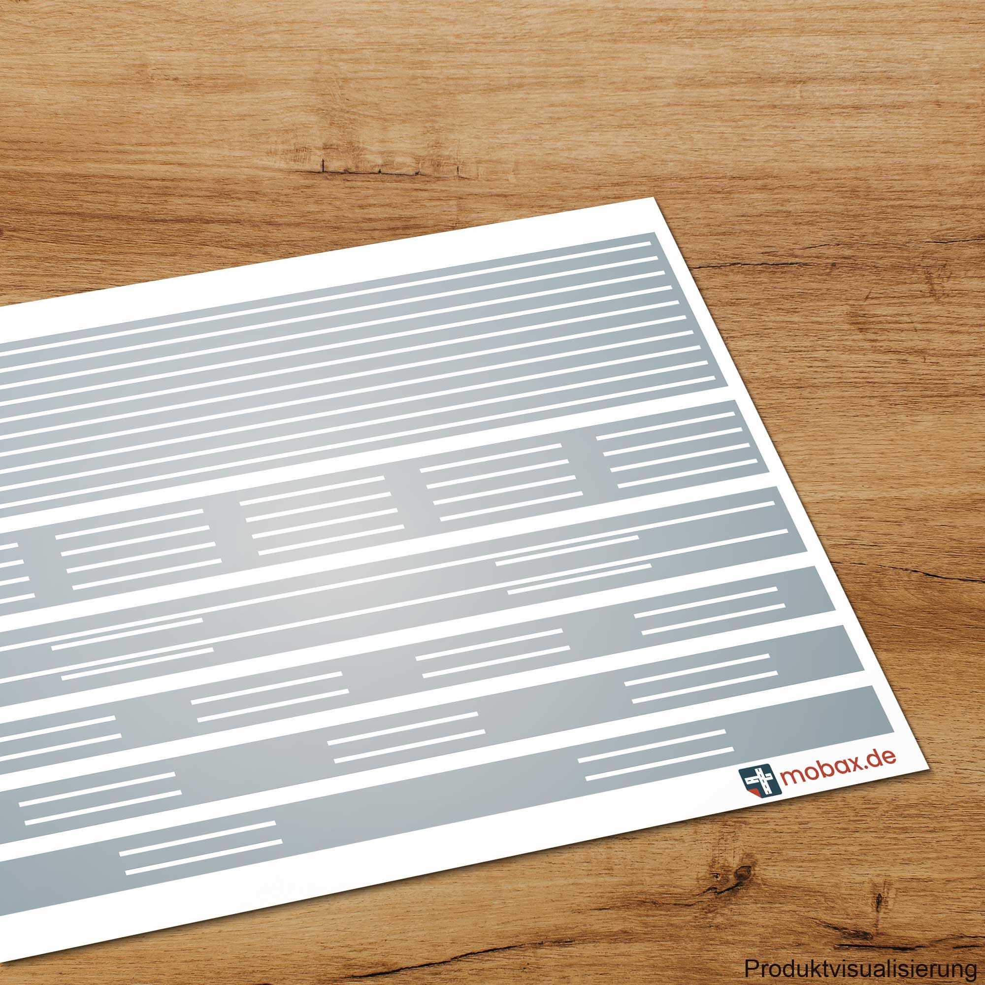 Spur N - 1:160 : Deutschland - Weiß, Landstraße - Linien-Set für die Längsmarkierungen auf Landstraßen.Die Linien entsprechen der genormten Größe für Landstraßen.Das Set beinhaltet die gängigen Längsmarkierungen inkl. Beispielen:Fahrbahnbegrenzung - 10Leitlinie (Schmalstrich, ohne Abstandsvorgabe) - 20Beispiel: einseitige Fahrbahnbegrenzung - 2Beispiel: Warnlinie (unterbrochener Schmalstrich) - 8Beispiel: Leitlinie (unterbrochener Schmalstrich innerhalb von Knotenpunkten) - 6Beispiel: normale Leitlinie (unterbrochener Schmalstrich außerhalb von Knotenpunkten) - 4Für dieses Set empfehlen wir unsere Übertragungsfolie.Anwendung:Die Linien lassen sich auf die individuellen Bedürfnisse anpassen, anordnen und zuschneiden. Lassen Sie Ihrer Kreativität freien Lauf und erschaffen Sie absolut realistätsnahe Modelle.Es handelt sich um hochwertige, selbstklebende Markierungsfolie mit sehr starker Haftung. Die flexiblen Markierungen passen sich perfekt dem Untergrund an und lassen sich in nahezu jedem Kurvenradius legen. Gestochene Randschärfe der einzelnen Elemente.