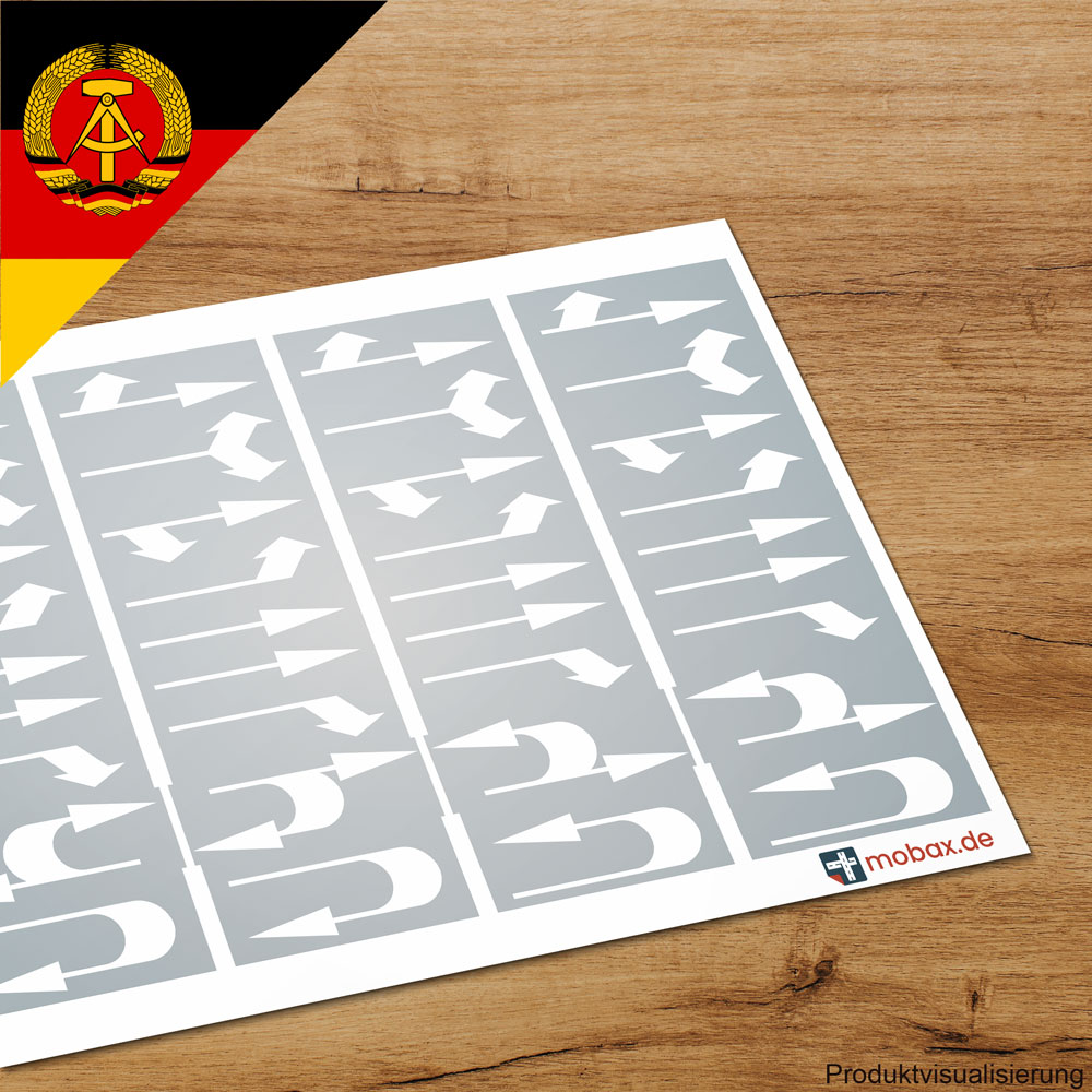 Spur N - 1:160 : Deutschland - Weiß, Stadt, Landstraße - Pfeile-Set DDR.Die Pfeile entsprechen der genormten Größe entsprechend der Straßenverkehrsordnung der DDR von 1977. Das Set beinhaltet eine große Auswahl der gängigen Pfeilsymbole:geradeaus und links ab - 4links und rechts ab - 4geradeaus und rechts ab - 4links ab - 4geradeaus - 8rechts ab - 4geradeaus und rechts / links zurück - je 2rechts / links zurück - je 2Für dieses Set empfehlen wir unsere Übertragungsfolie und unsere Pinzette (spitz).Anwendung:Die Pfeile lassen sich auf die individuellen Bedürfnisse anpassen und anordnen. Lassen Sie Ihrer Kreativität freien Lauf und erschaffen Sie absolut realistätsnahe Modelle.Es handelt sich um hochwertige, selbstklebende Markierungsfolie mit sehr starker Haftung. Gestochene Randschärfe der einzelnen Elemente.