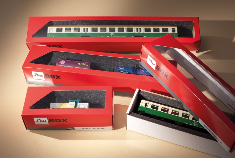 Lager- und Transportboxen für Loks und Wagen, denn mit der Zeit werden die Verpackungen Ihrer Schmuckstücke unansehnlich. Unsere attraktiven Schachteln schaffen Abhilfe. Deckel aus Karton mit Klarsichtfenster. Kasten aus stabiler Mikrowelle. Der Schaumstoffeinsatz schützt Ihre Fahrzeuge vor Beschädigungen. Die Faltschachteln sind leicht aufzustellen. Versand flachliegend.