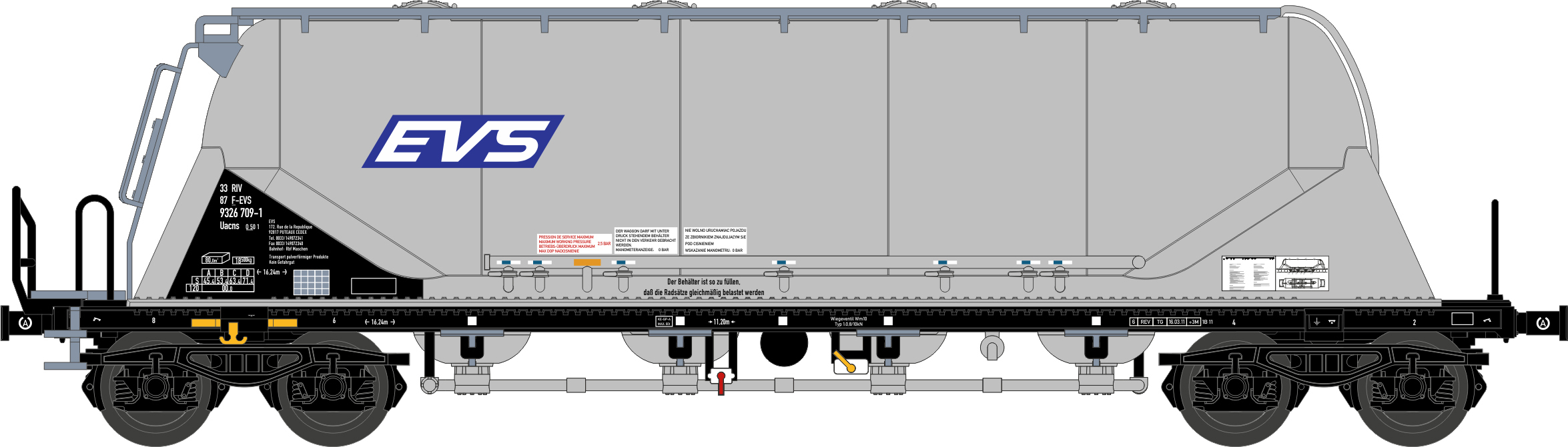 Staubsilowagen der Bauart Uacns (82m³) der EVS für die Epoche 6. Mit neuem EVS Logo. Seit einigen Jahren stellt die Firma Feldbinder Staubsilowagen vom Typ Uacns her. Sie sind unter anderem geeignet zum Transport von Zement. Modell: Viele angesetzte Metall- und Kunststoffteile geben das Erscheinungsbild des Vorbilds im Maßstab 1:160 sehr gut wieder. Das NME-Modell verfügt über Kurzkupplungskulisse, NEM-Schacht und perfekte Laufeigenschaften.