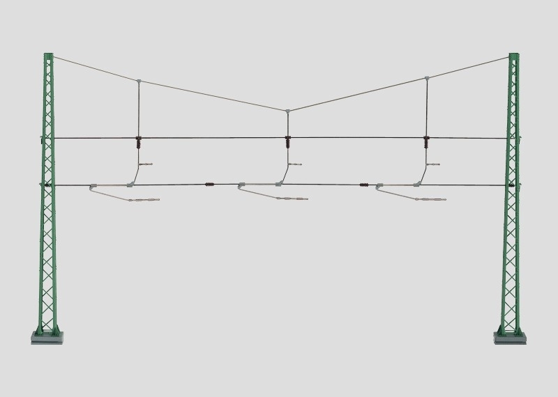 Vormontierte Einheit aus Richtseilen, Quertragseilen und 3 verschiebbaren Fahrdrahthängern. 2 Turmmasten aus Metall auf Sockeln mit Befestigungsschraube und Steckverbindung. Mastabstand bis zu 235 mm einstellbar. Richtseile aus geschweißtem Stahldraht, Quertragseile elastisch, Masten und Fahrdrahthalter elektrisch getrennt. Masthöhe 150 mm.