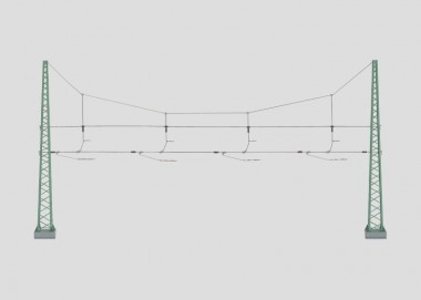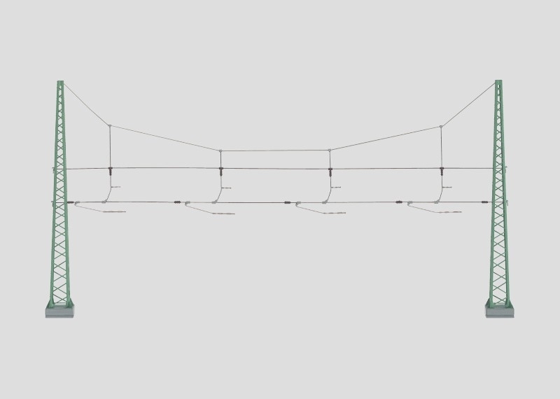 Vormontierte Einheit aus Richtseilen, Quertragseilen und 4 verschiebbaren Fahrdrahthängern. 2 Turmmasten aus Metall auf Sockeln mit Befestigungsschraube und Steckverbindung. Mastabstand bis zu 312,5 mm einstellbar. Richtseile aus geschweißtem Stahldraht, Quertragseile elastisch, Masten und Fahrdrahthalter elektrisch getrennt. Masthöhe 170 mm.