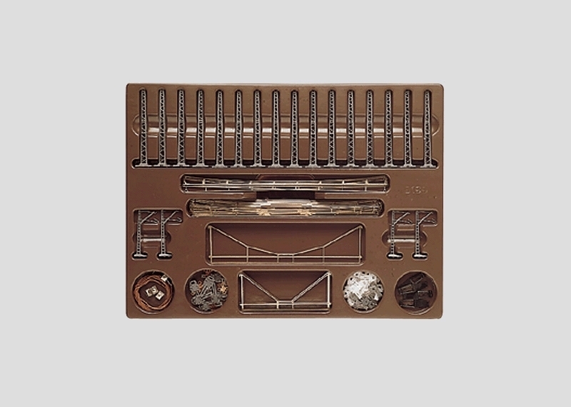 Ergänzung zu 8198 für T1 bis T3. Inhalt: 4 Masten für Fahrleitung, 16 Turmmasten, 30 Fahrdrahtstücke, 8 Querverbindungen, 30 Fahrdrahtisolierungen, 8 Trennstücke, 6 Verbindungsfedern, 5 Fahrdrahtklemmen und Aufbauanleitung.