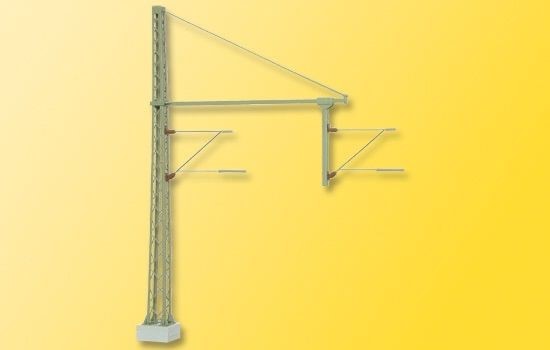 Komplett mit Turmmast, fertig montiert und lackiert. Mit 2 elektrisch getrennten Auslegern. Die Auslegereinheiten sind frei verschiebbar und umklipsbar. Mit rückseitiger Aussparung zur Aufnahme weiterer Ausleger. Filigrane Metallausführung mit eingeprägten Nietenimitationen. Maximale Spannweite: 5,7 cm, Höhe: 8,2 cm.