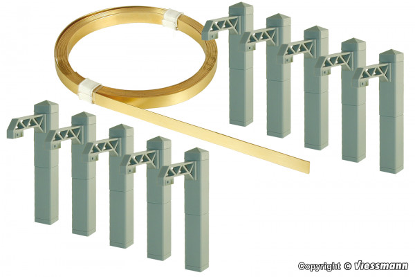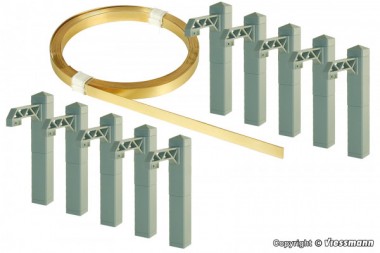 Das Set besteht aus 10 Masten, 3 m Fahrleitungsband und Befestigungsschrauben. Für eine schnelle und einfache Verlegung an ein- und mehrspurigen Tunnelstrecken. Die Tunneloberleitung ist universell einsetzbar und kompatibel zu allen gängigen Gleissystemen. Auch für Schattenbahnhöfe mit Weichen und Kreuzungen oder Gleiswendeln geeignet. Masthöhe: 6,75 cm, Auslegerhöhe: 4,5 cm.