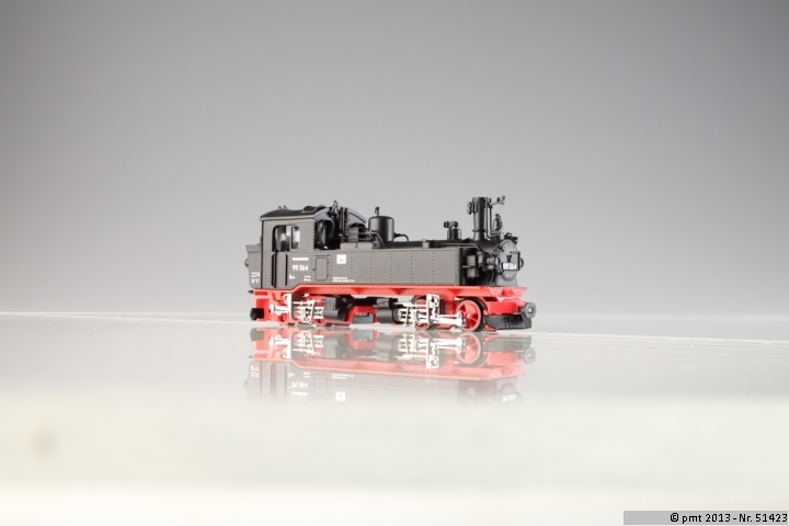 Dampflok IVK in schwarz der DR (Faulhabermotor). Modelldetails: Zweileiter-Gleichstrom. Länge über Puffer: 106 mm. Trichterkupplung. Antrieb durch Glockenankermotor mit Schwungmasse. Alle Achsen angetrieben. Stromabnahme von allen acht Rädern. Vollbewegliche Heusinger-Steuerung. Mittelpuffer- und Hakenkupplung zur wahlweisen. Selbstmontage beiliegend. Vorbild: Die IVK war auch in den fünfziger Jahren auf vielen Schmalspurstrecken der Reichsbahn die typische Lok. Wie beim Vorbild erfolgte auch am Modell die Nachrüstung mit zusätzlichen Dampfentnahmeventilen und Körting-Saugluftbremse, wobei die Heberlein-Bremseinrichtung voll erhalten blieb. Aufsatzbretter gestatteten das Mitführen eines höheren Kohlevorrates und damit längere Laufzeiten.