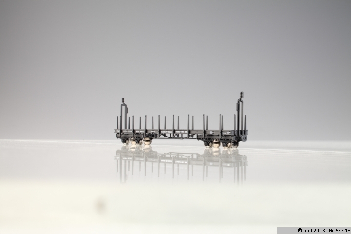 Rungenwagen der DRG für Leichtguttransport Modelldetails: Länge über Puffer: 110 mm. Mit Trichterkupplung. Als Drehgestell dienen die kurzen Drehschemelwagen. Ladefläche mit je acht Seiten- und vier Stirnrungen, Heberleinrollen. Sprengwerke in schwarz. Längsträger der Ladefläche bedruckt. Mit Mittelpufferkupplung.