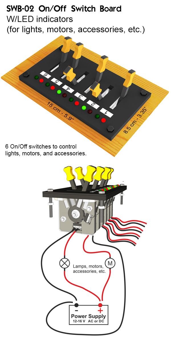 Ein-/Aus Schaltpult/Schaltafel, steuert Lichter, Motoren und Zubehör,mit 6 Umleghebeln und je 6 Kontroll-LEDs /grün/rot .