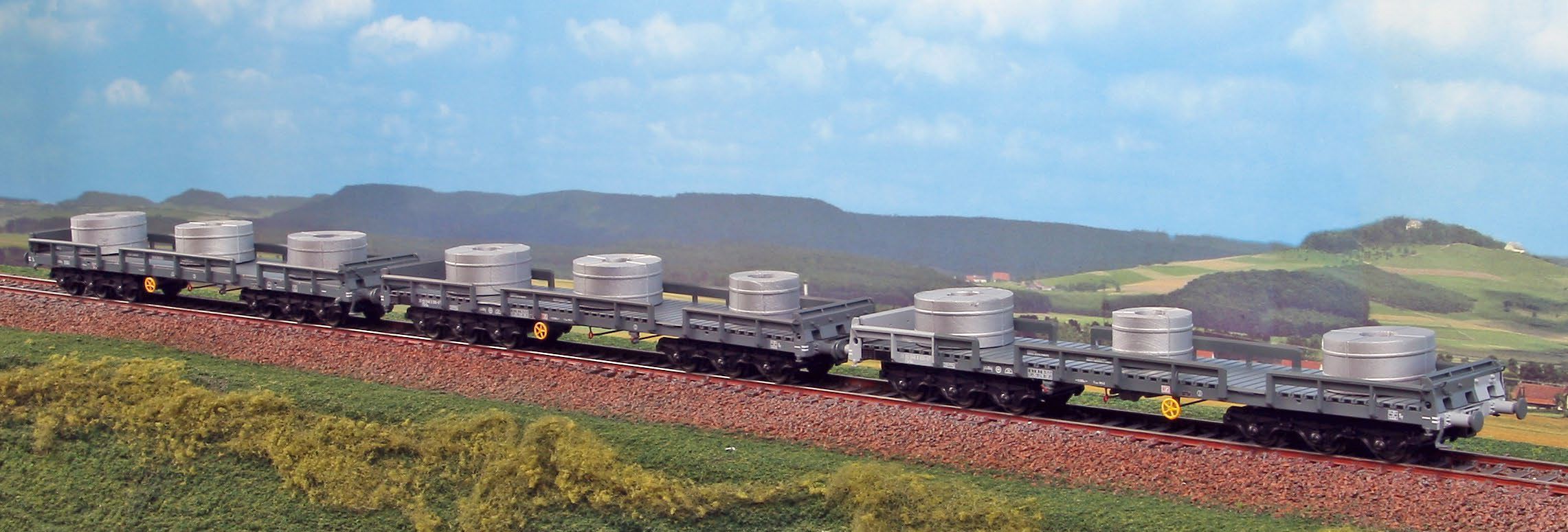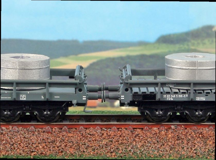 Ergänzungsset "Italsider-Zug", bestehend aus drei Sa-Privatwagen, beladen mit unterschiedlich großen Coils zur Kombination mit Set 45130 zur Nachbildung der charakteristischen Konvois für den Transport von Blechrollen. Epoche IV-V