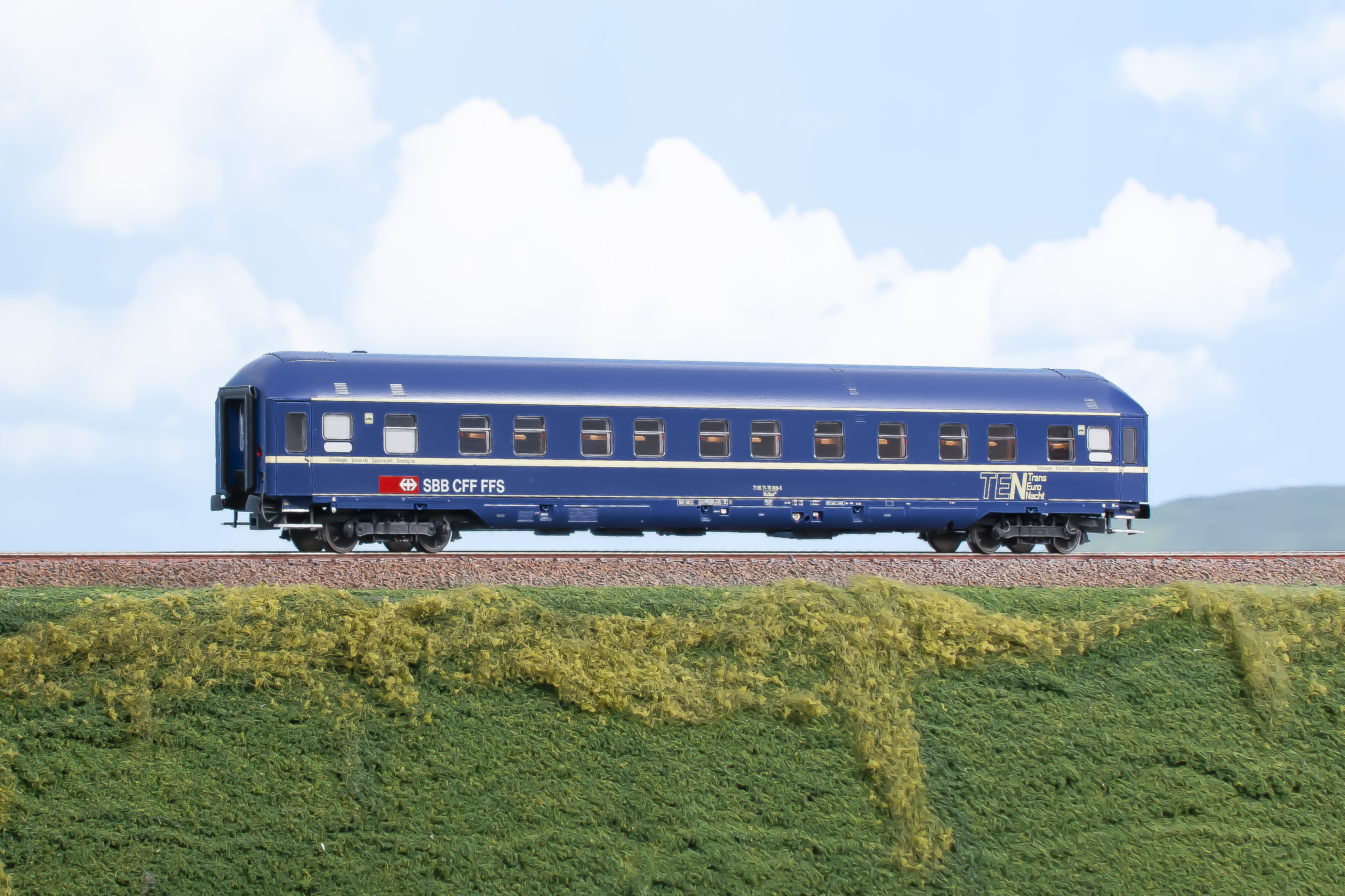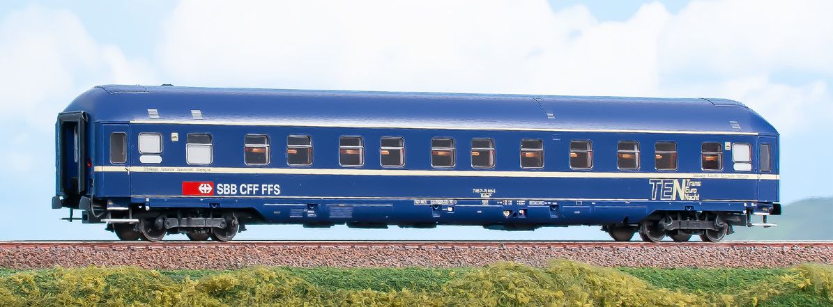 Schlafwagen Bauart WLABmh 174 in blauer TEN-Lackierung der SBB mit Drehgestellen München-Kassel, für die Epoche 4/5.