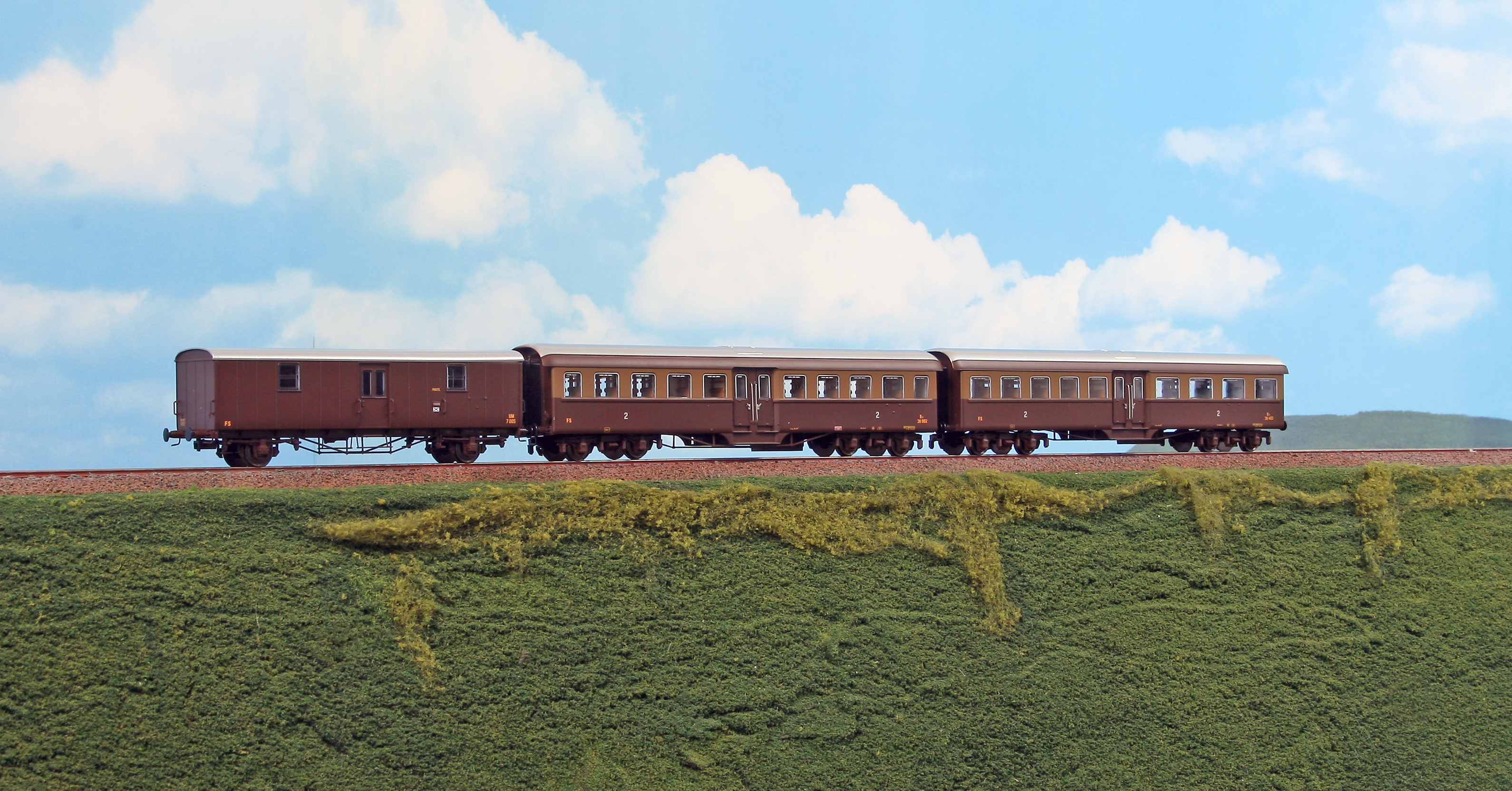 Set "Corbellini-Zug", bestehend aus einem Postwagen UM 7000 in Kastanienbrauner-Lackierung und zwei Corbellini Wagen in Kastanienbrauner/Isabella-Lackierung Typ 1951R, davon einer gemischt und einer der Serie 38000 (kurzer Wagen) der FS, Epoche III