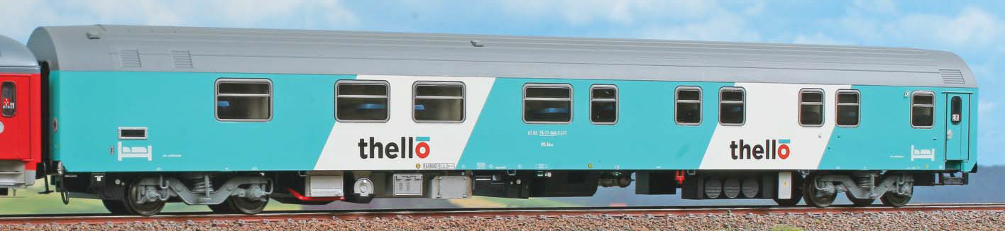 Nachtzug-Set "Thello" bestehend aus einem UIC-X-Liegewagen mit gesicktem Dach und einem T3-Schlafwagen, in der seit 2016 angewendeten neuen Lackierung.